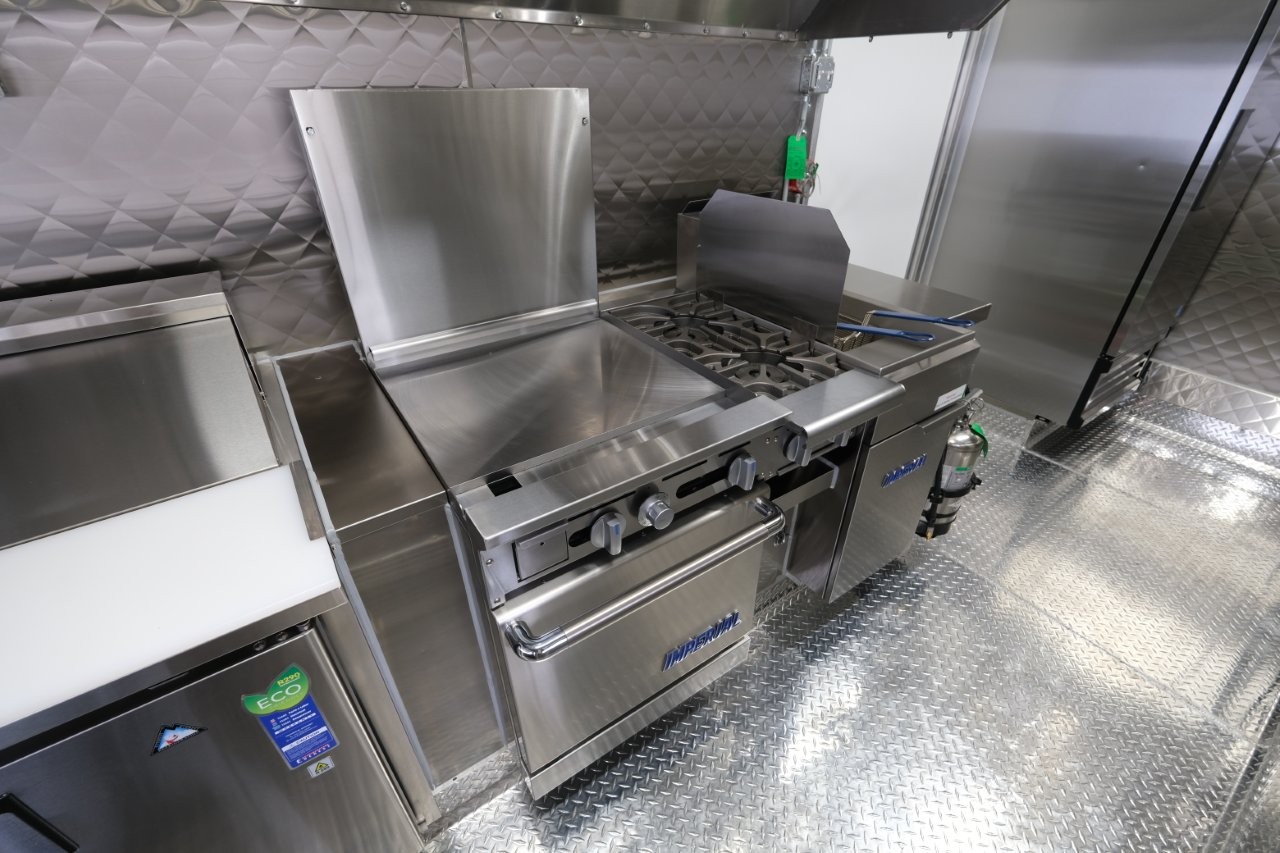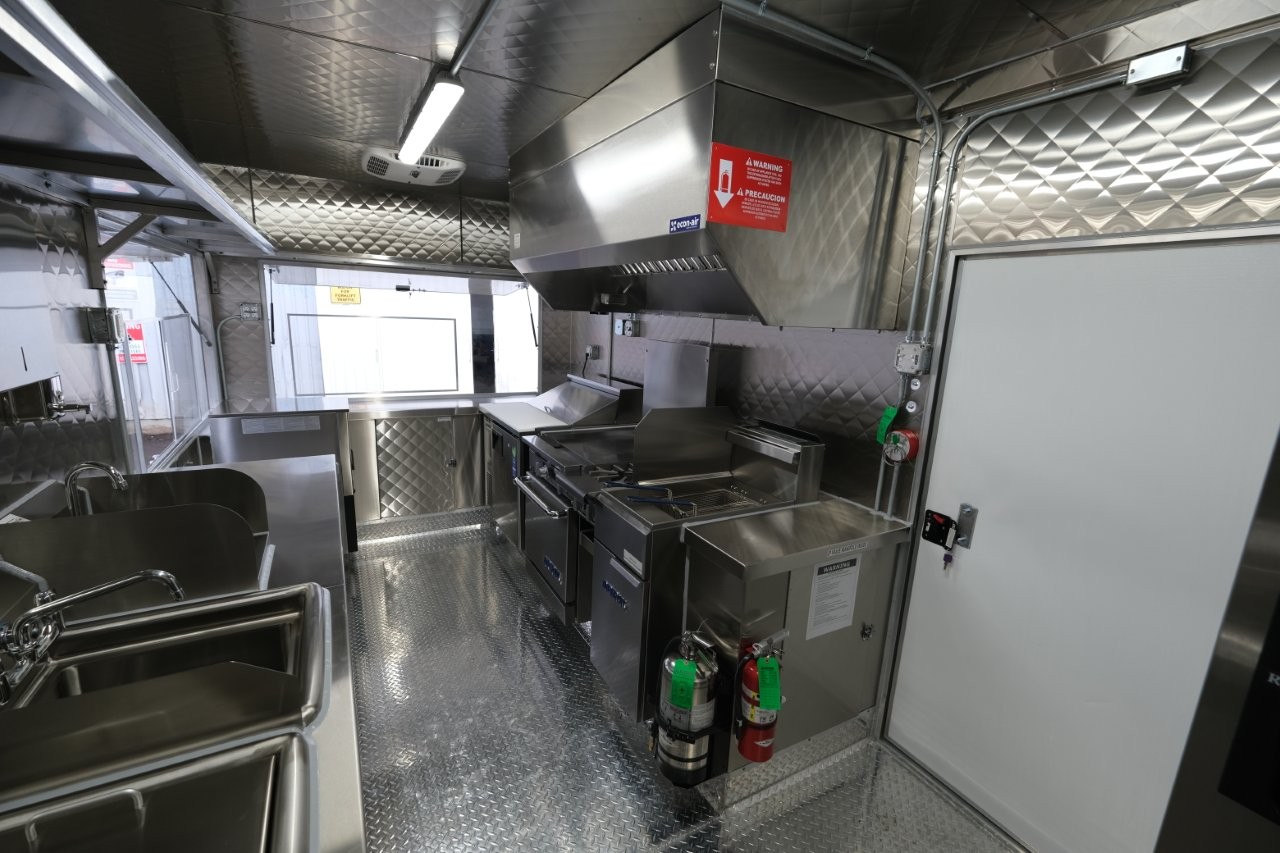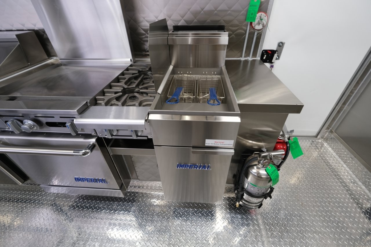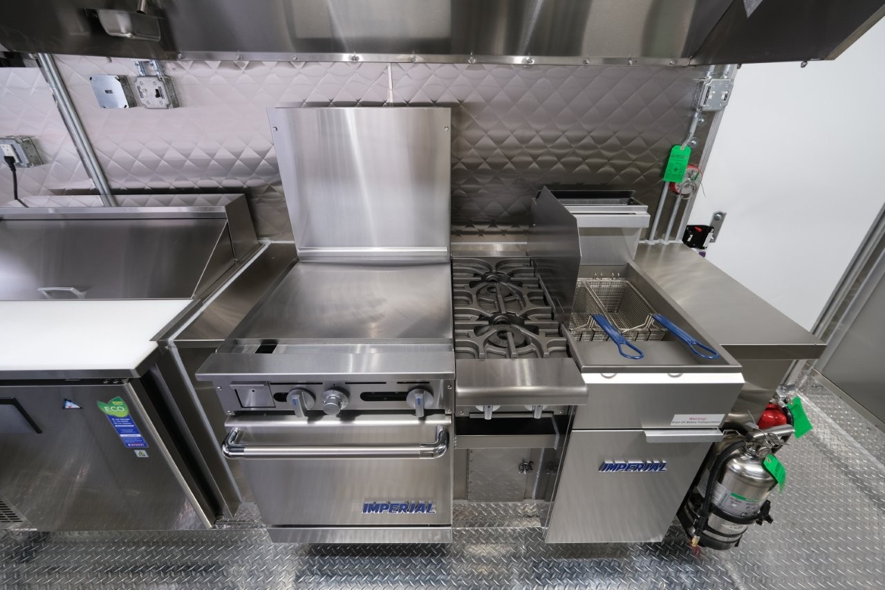 Ice machine, 24″ griddle with an oven below, double-basket deep fryer, generator platform, aluminum menu board