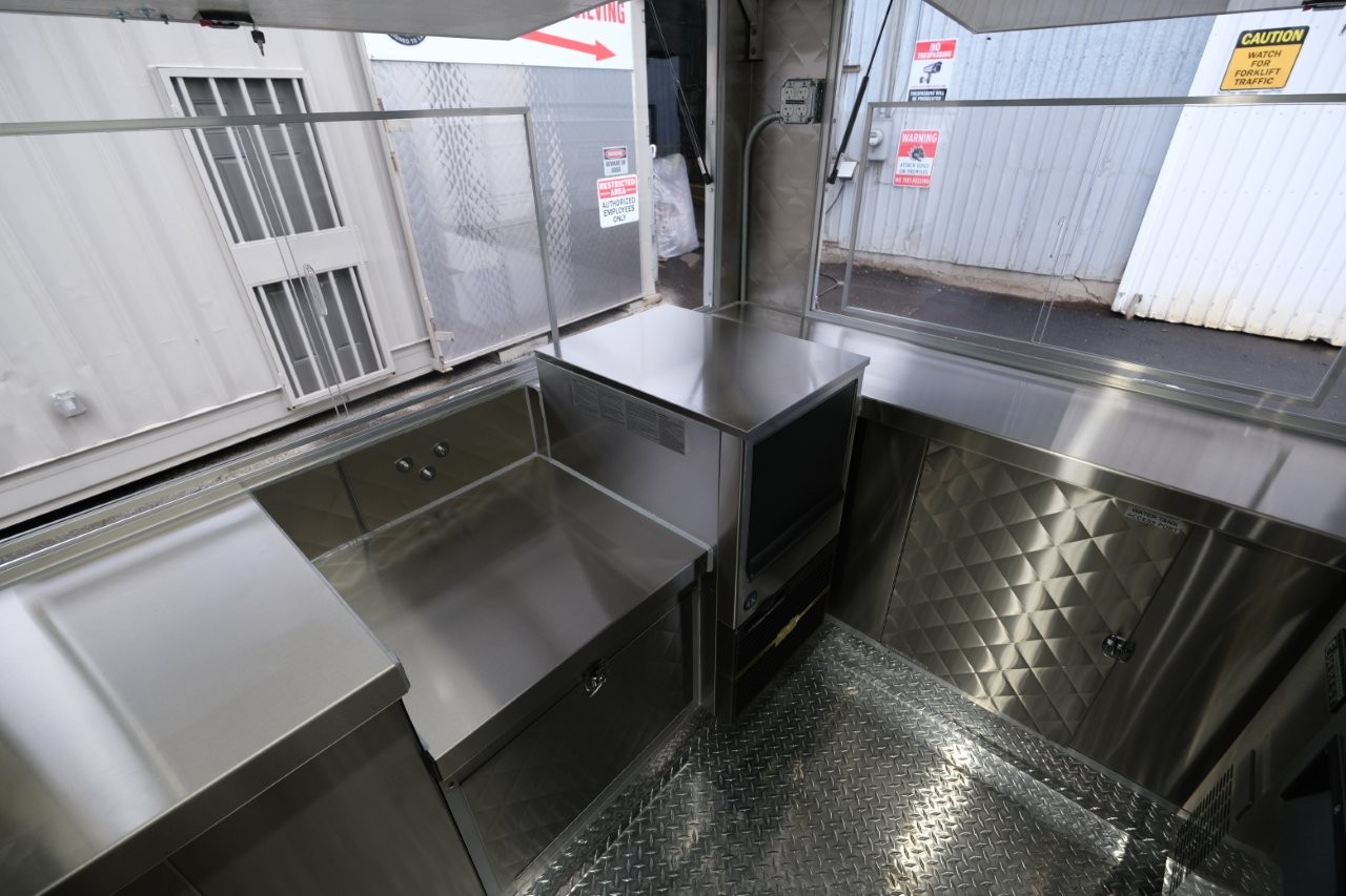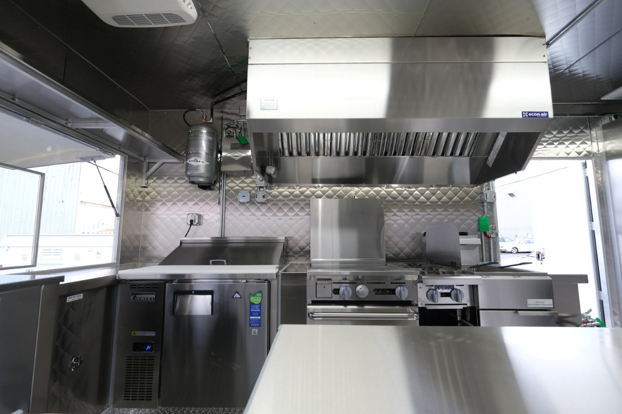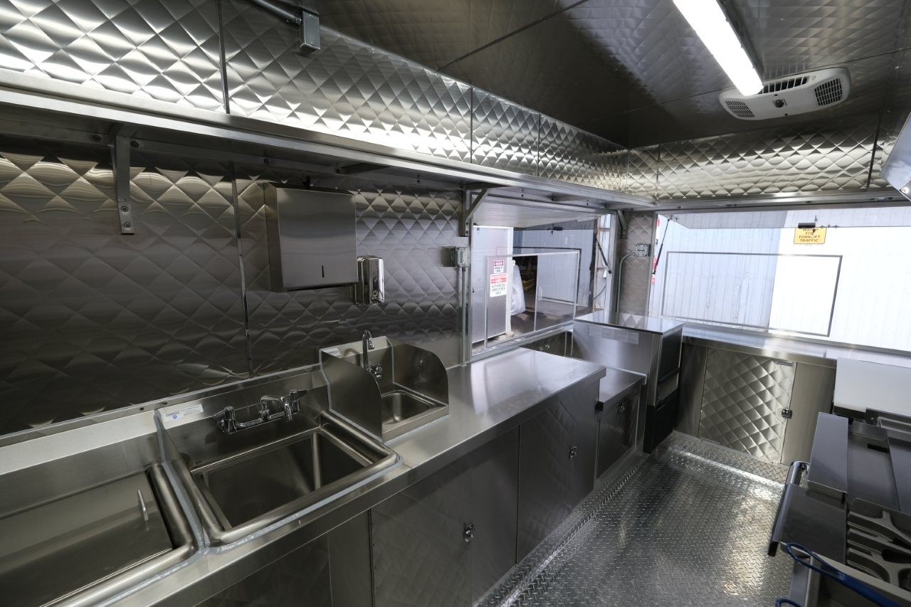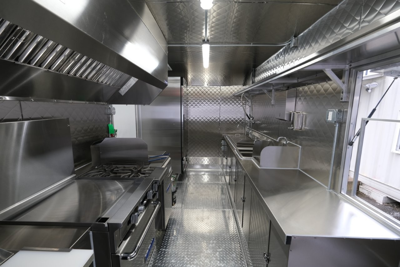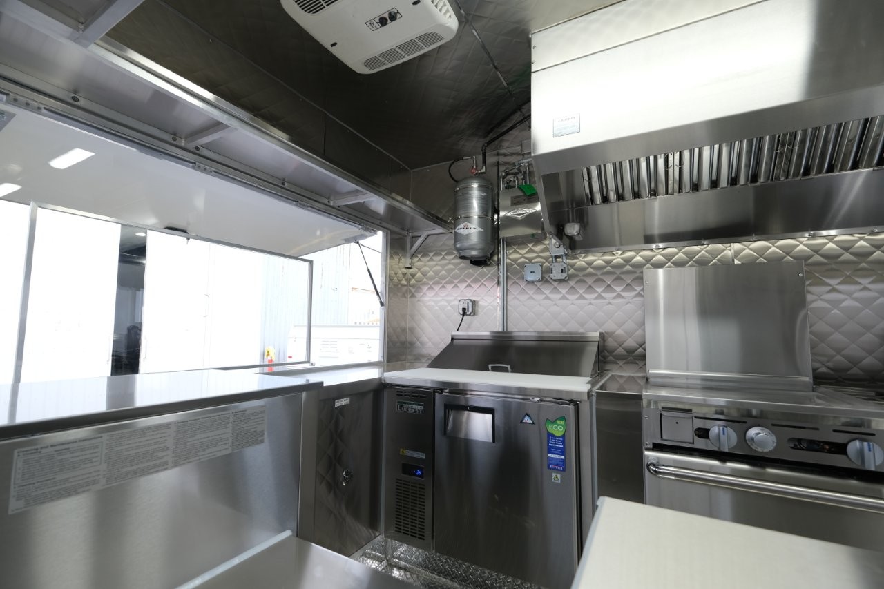 Ice machine, 24″ griddle with an oven below, double-basket deep fryer, generator platform, aluminum menu board