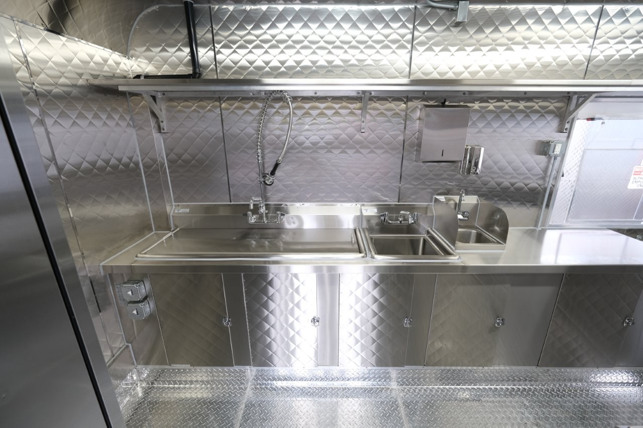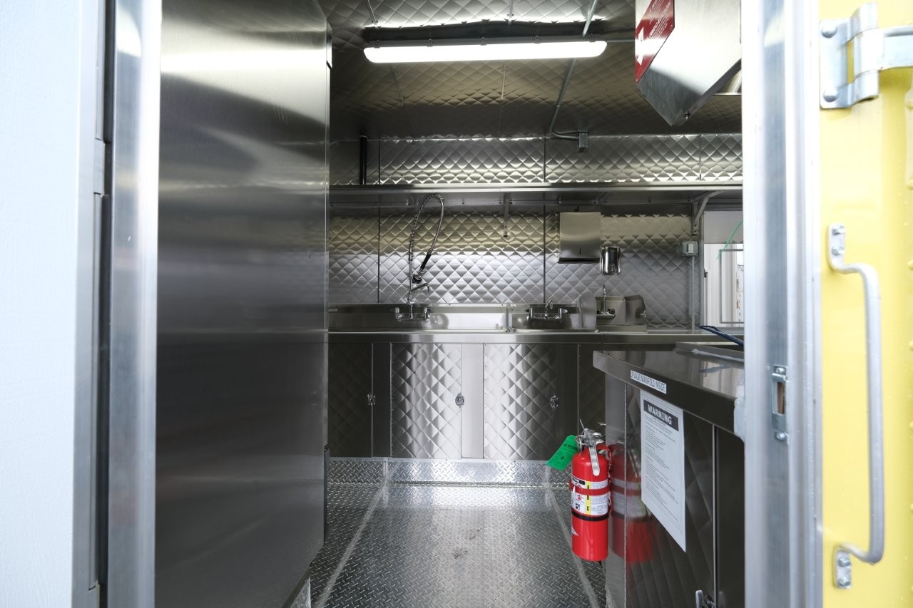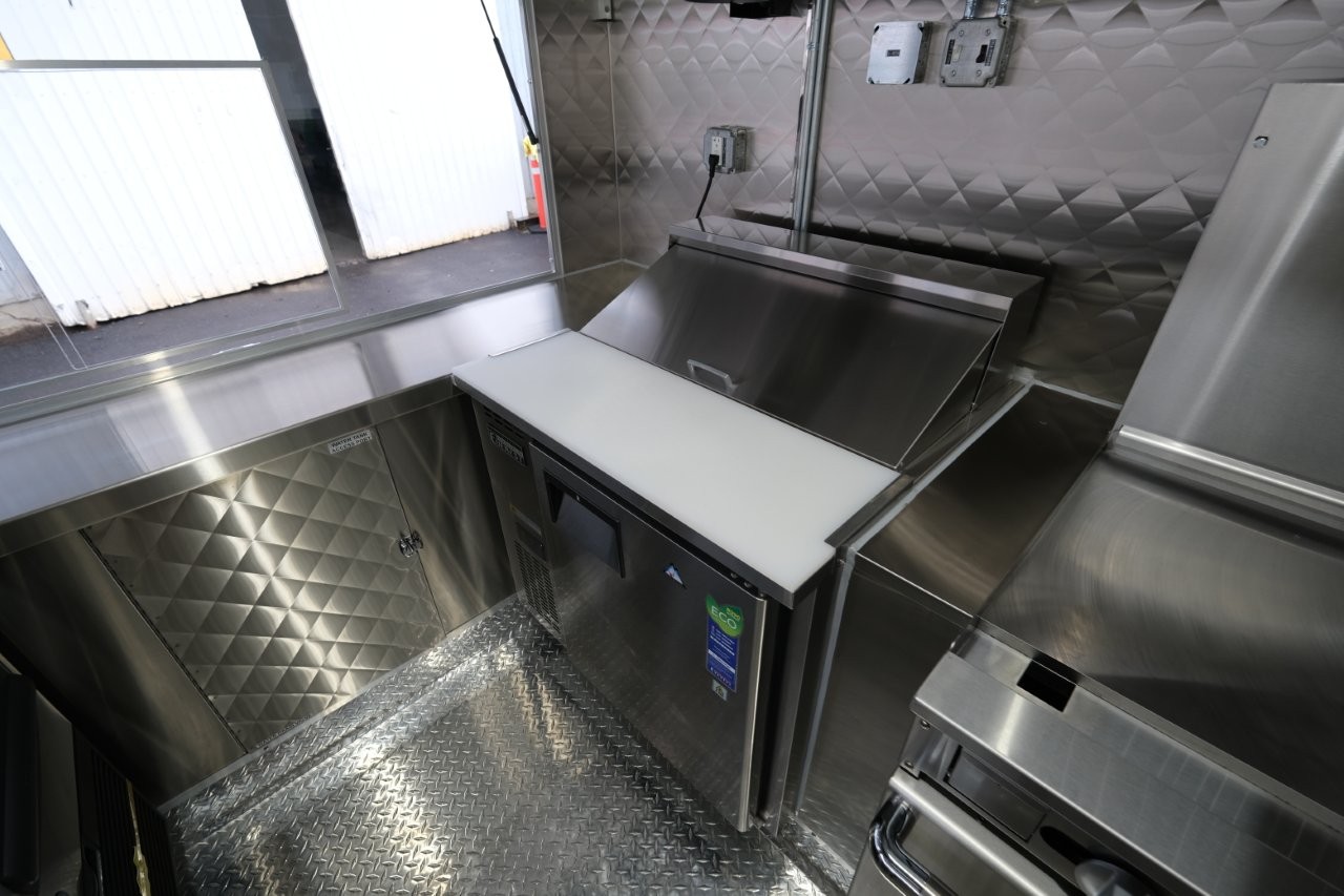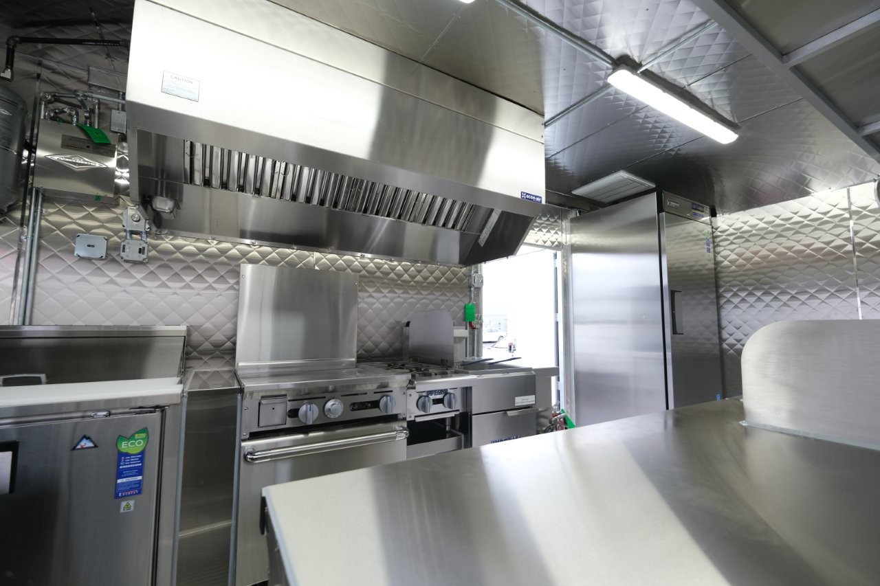 Ice machine, 24″ griddle with an oven below, double-basket deep fryer, generator platform, aluminum menu board