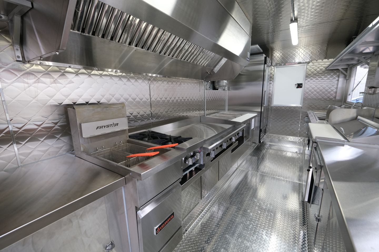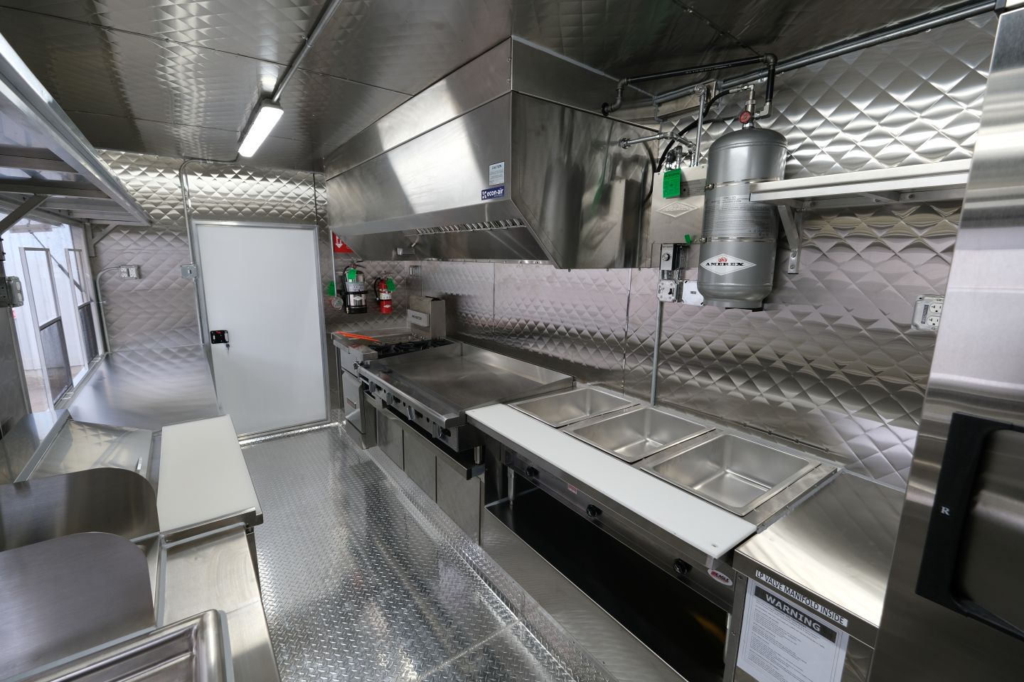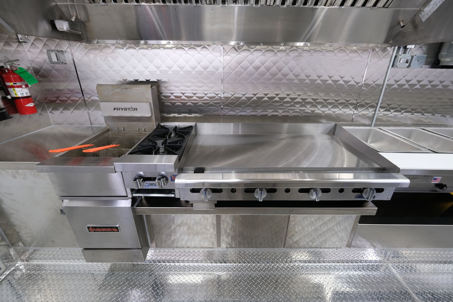 3-well steam table, 48″ griddle, 2-open burner, double-basket deep fryer