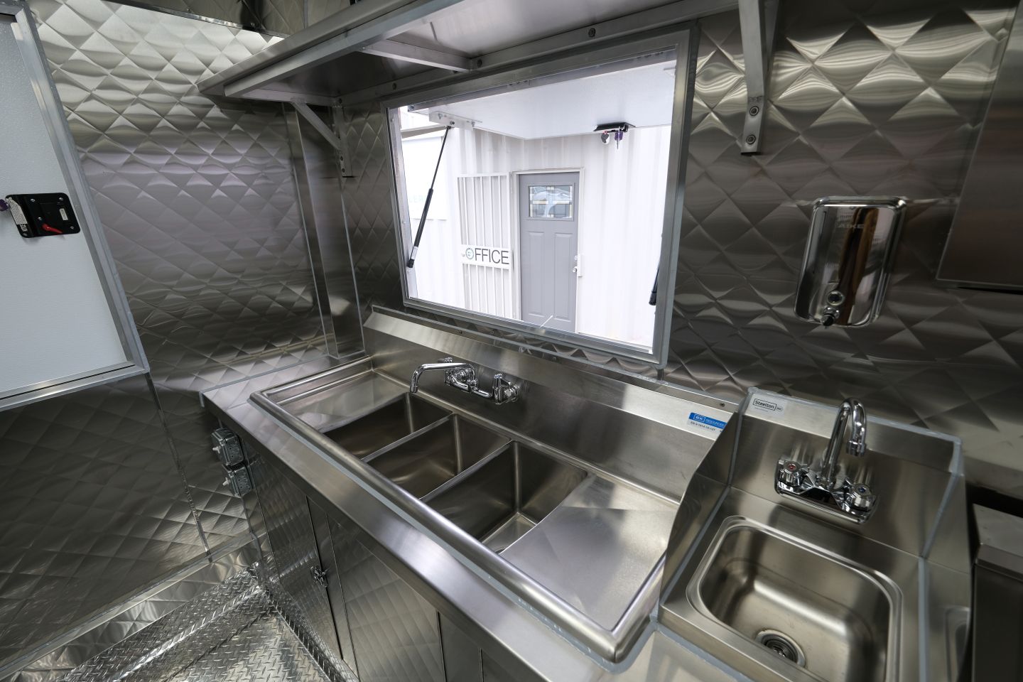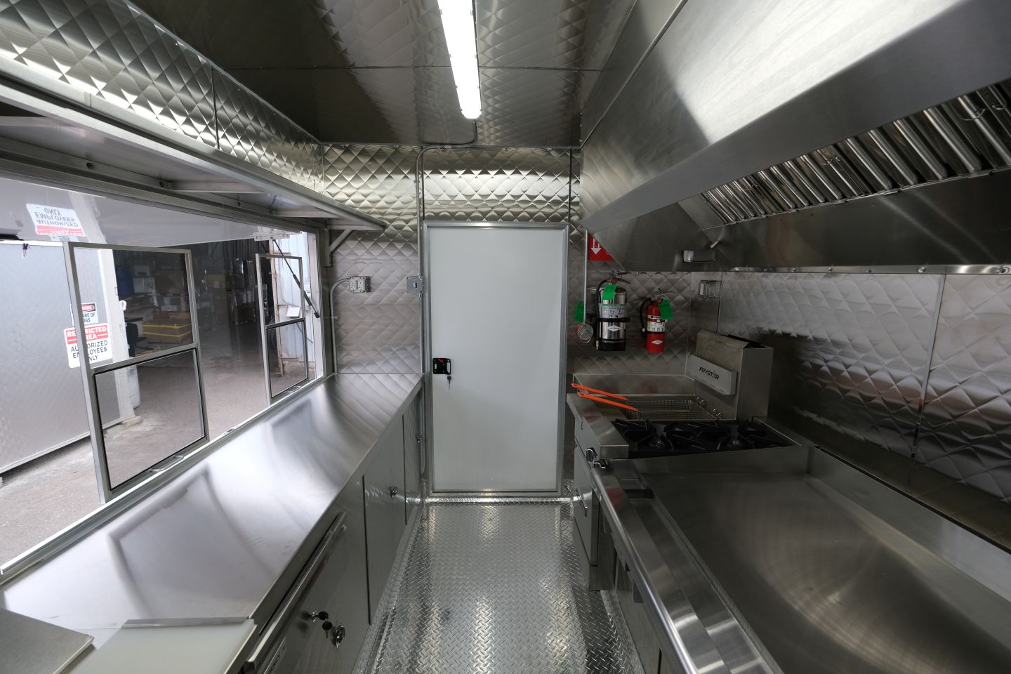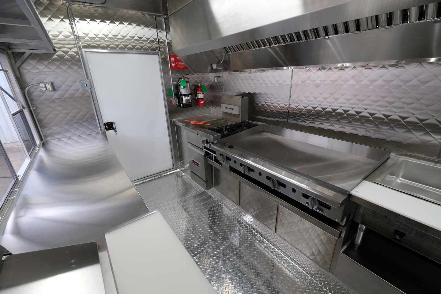 3-well steam table, 48″ griddle, 2-open burner, double-basket deep fryer