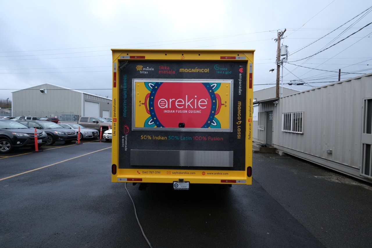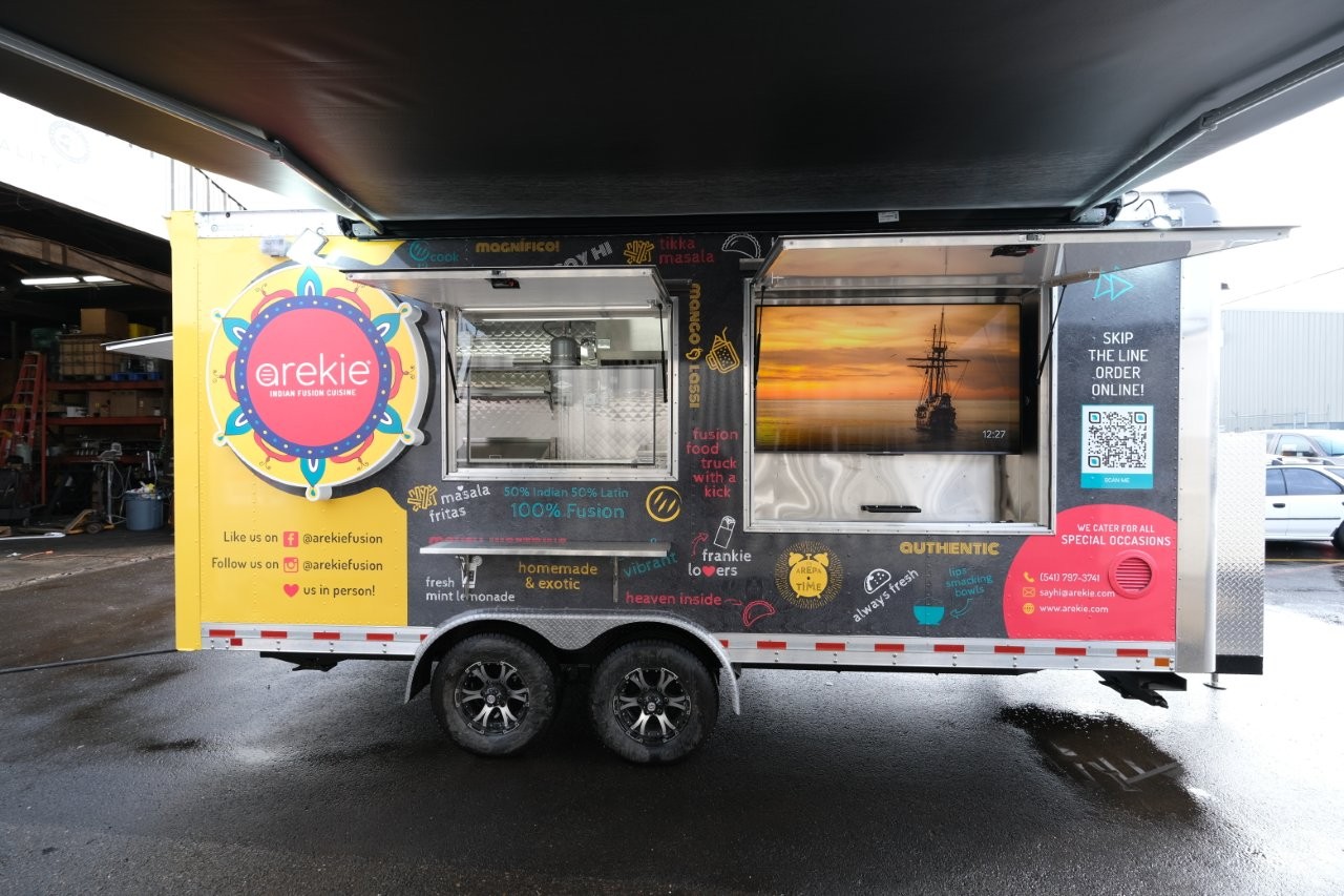 Custom wrap, electronic awning, digitial TV menu with self-serve kiosk area, exterior LED lighting, custom business sign
