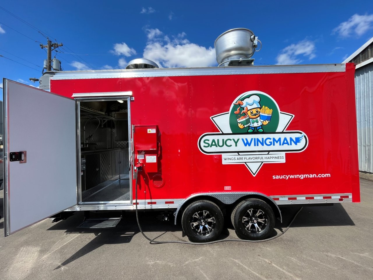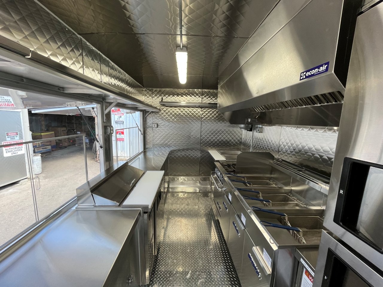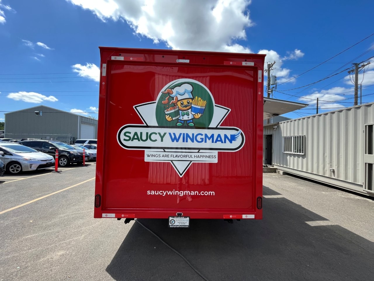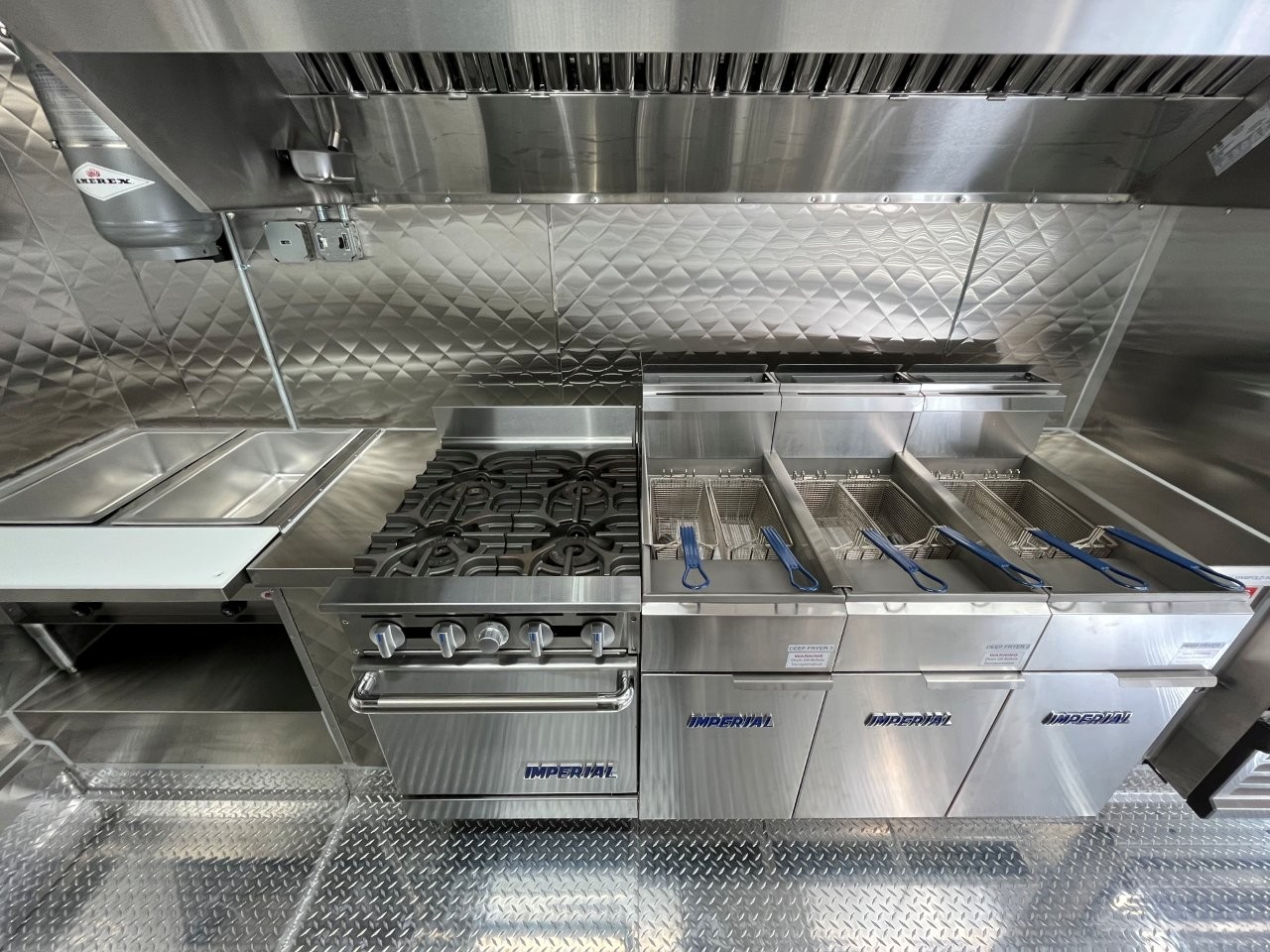 Three double-basket deep fryers, 2-well steam table, digital TV menu, custom wrap, bright red color paint job, security locks on door and windows
