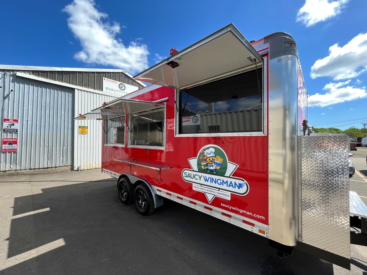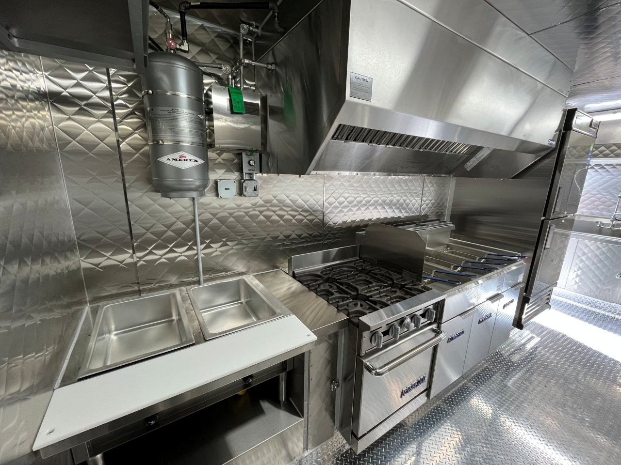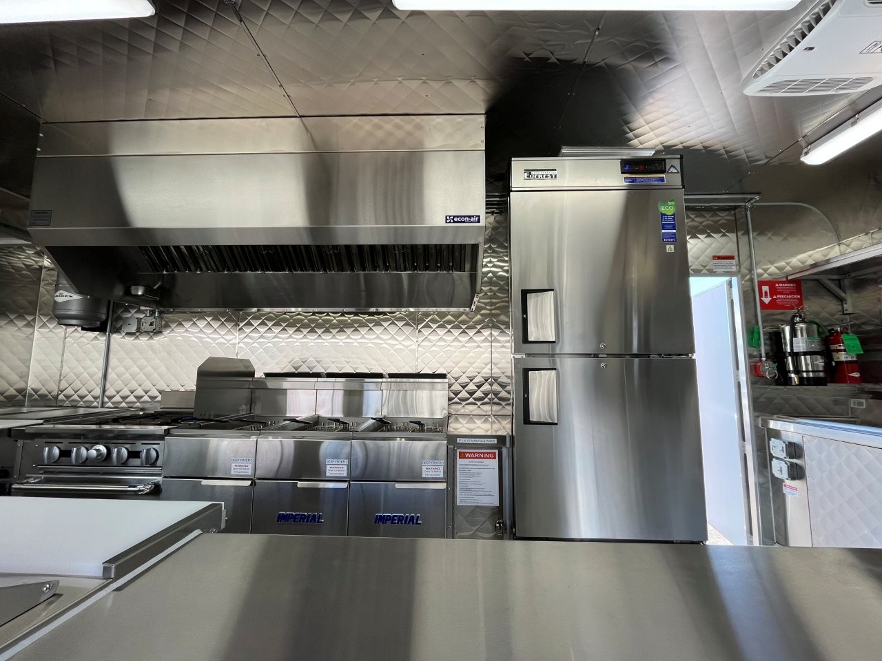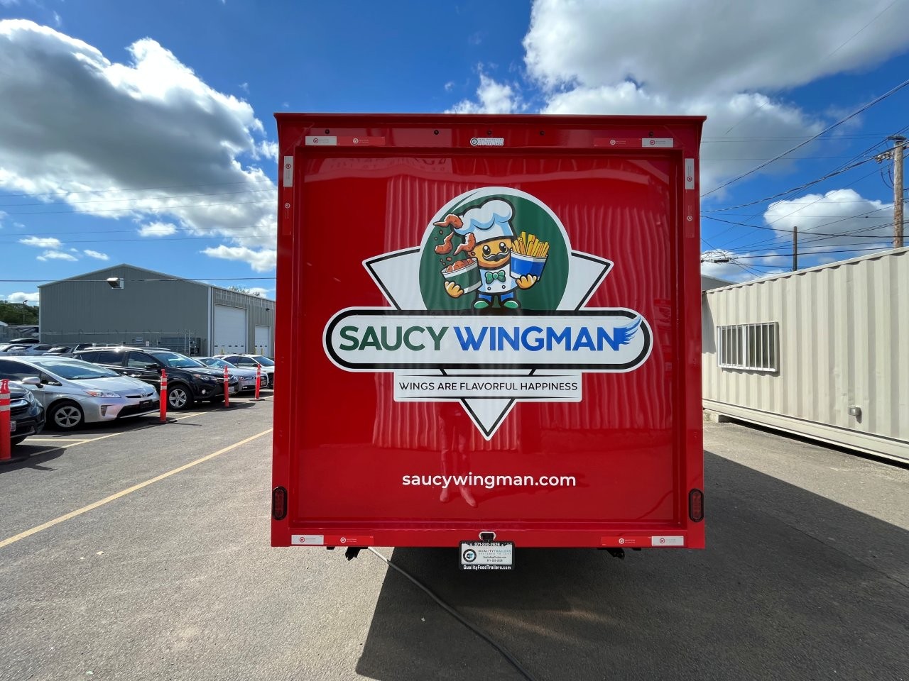 Three double-basket deep fryers, 2-well steam table, digital TV menu, custom wrap, bright red color paint job, security locks on door and windows