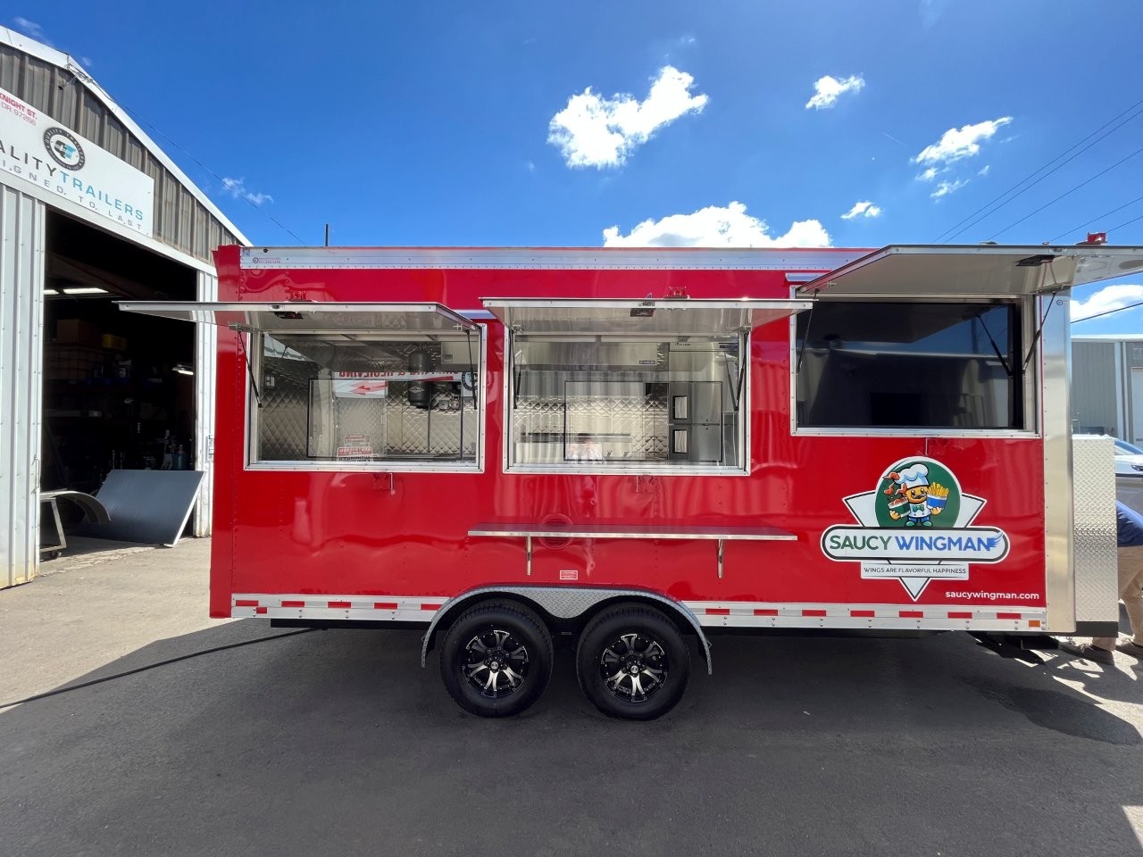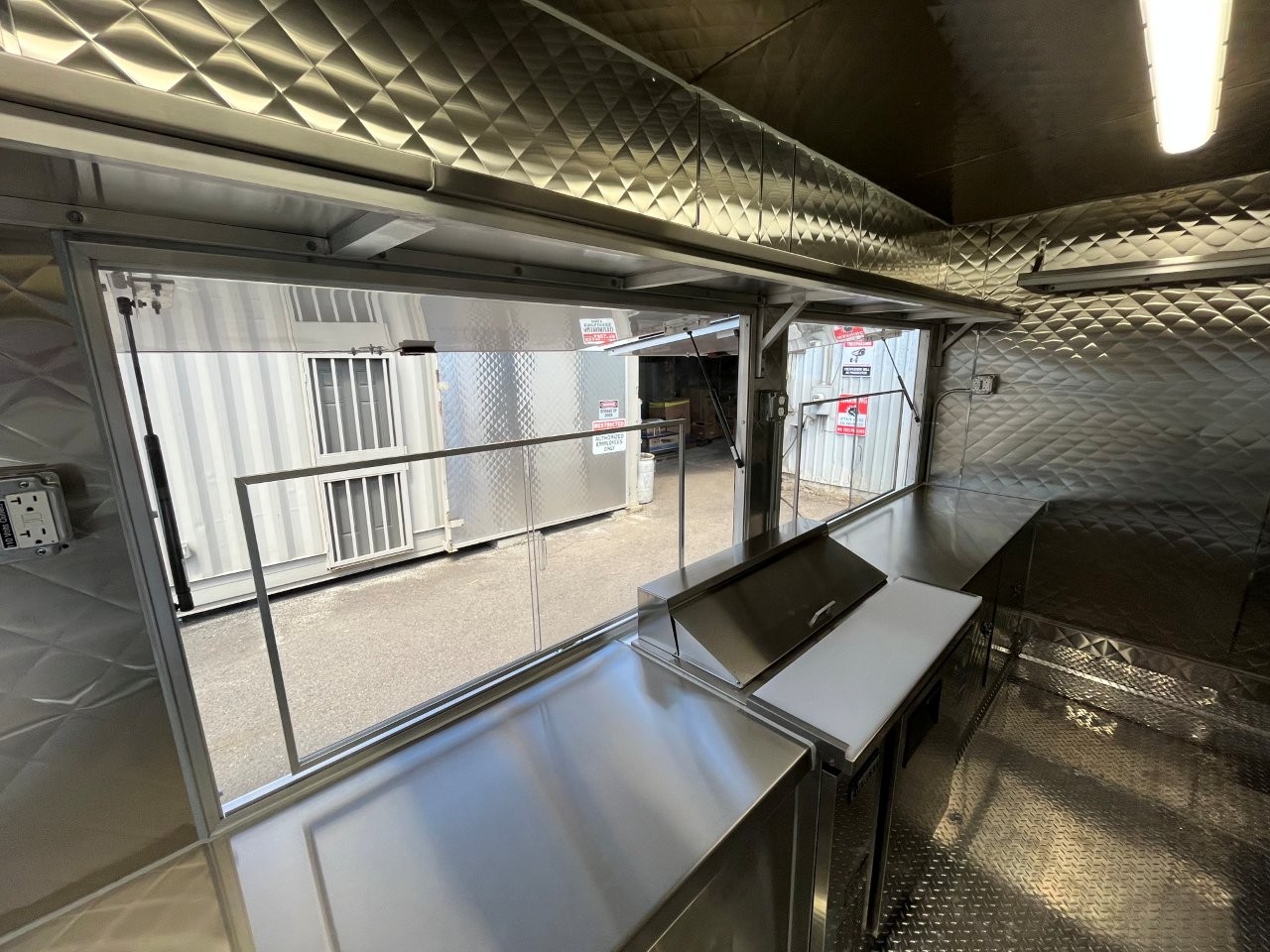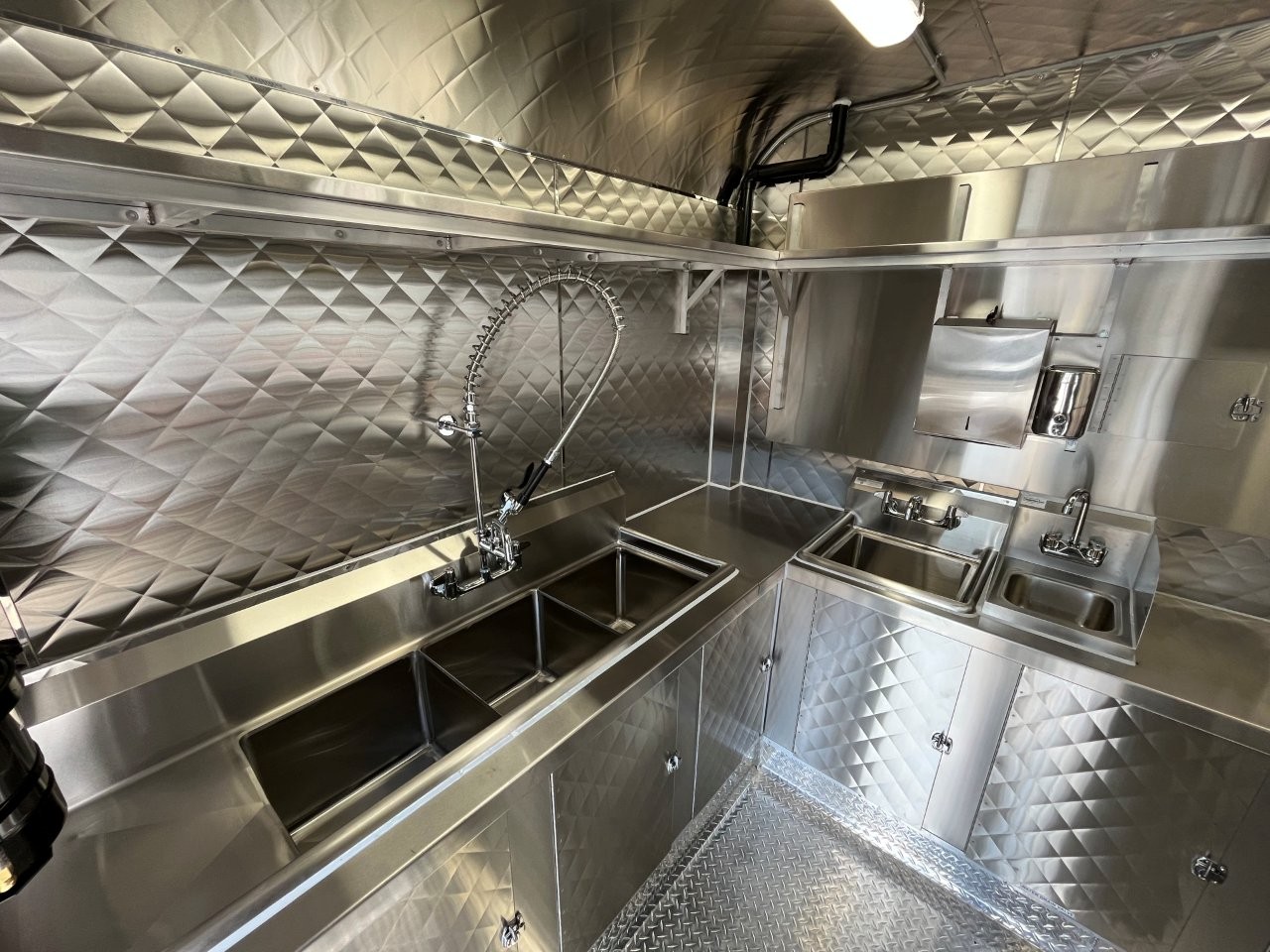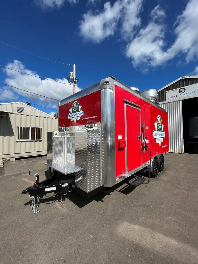 Three double-basket deep fryers, 2-well steam table, digital TV menu, custom wrap, bright red color paint job, security locks on door and windows