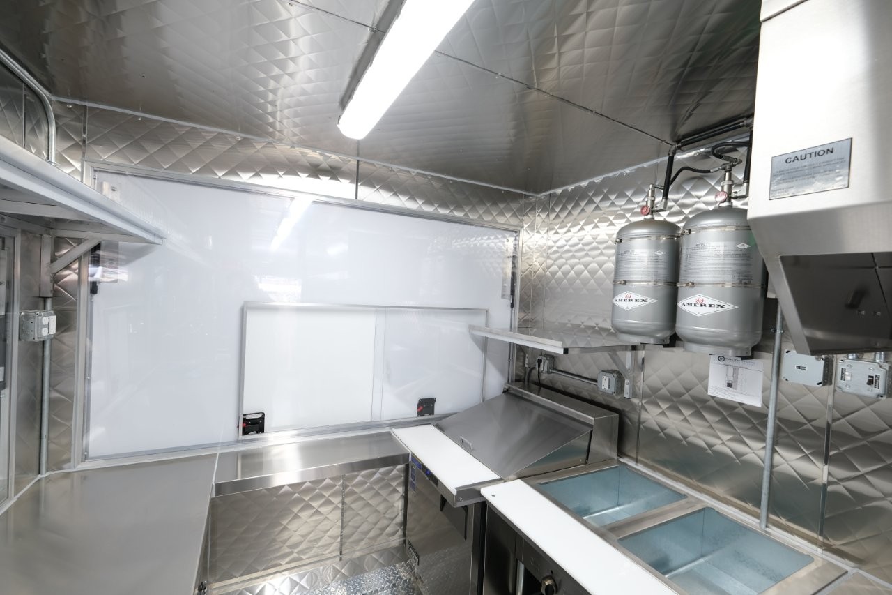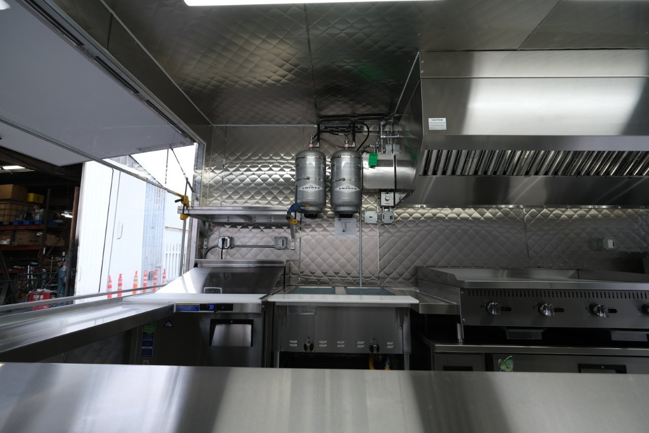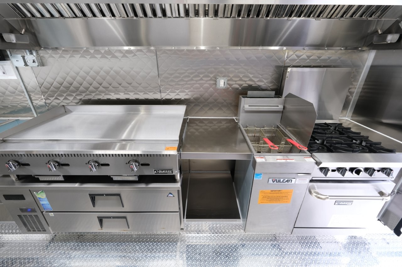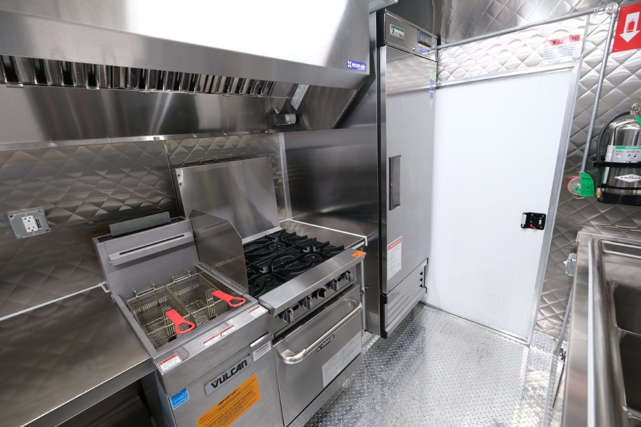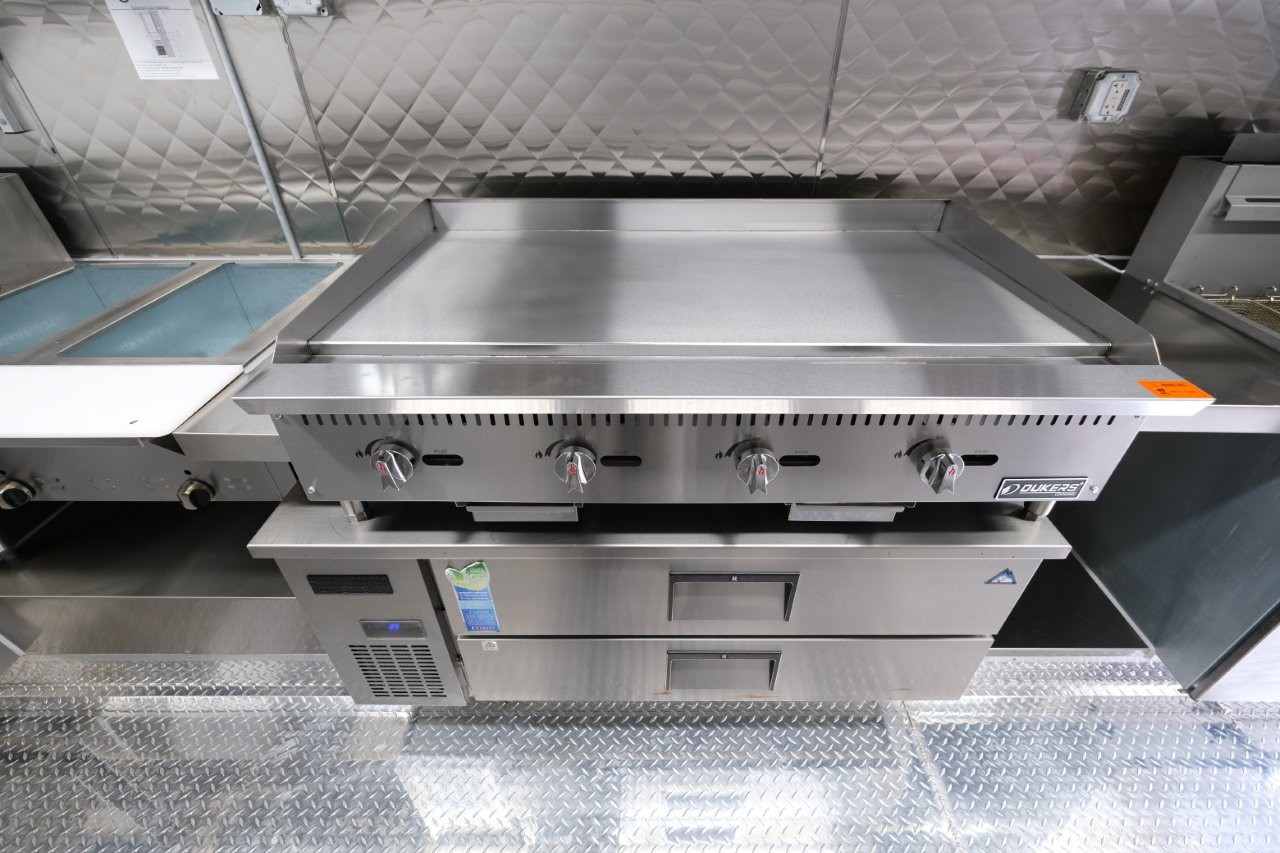 Custom wrap, 48″ griddle on a 52″ chef base, extra large rear window, deep fryer, 28″ mega-top sandwich prep table