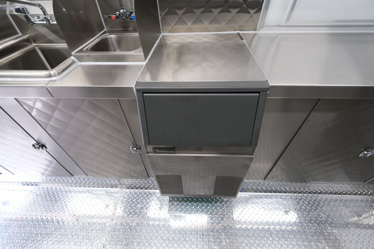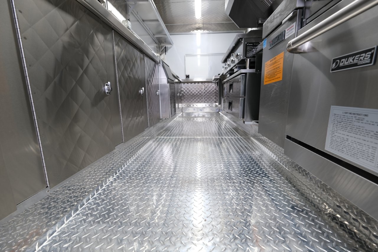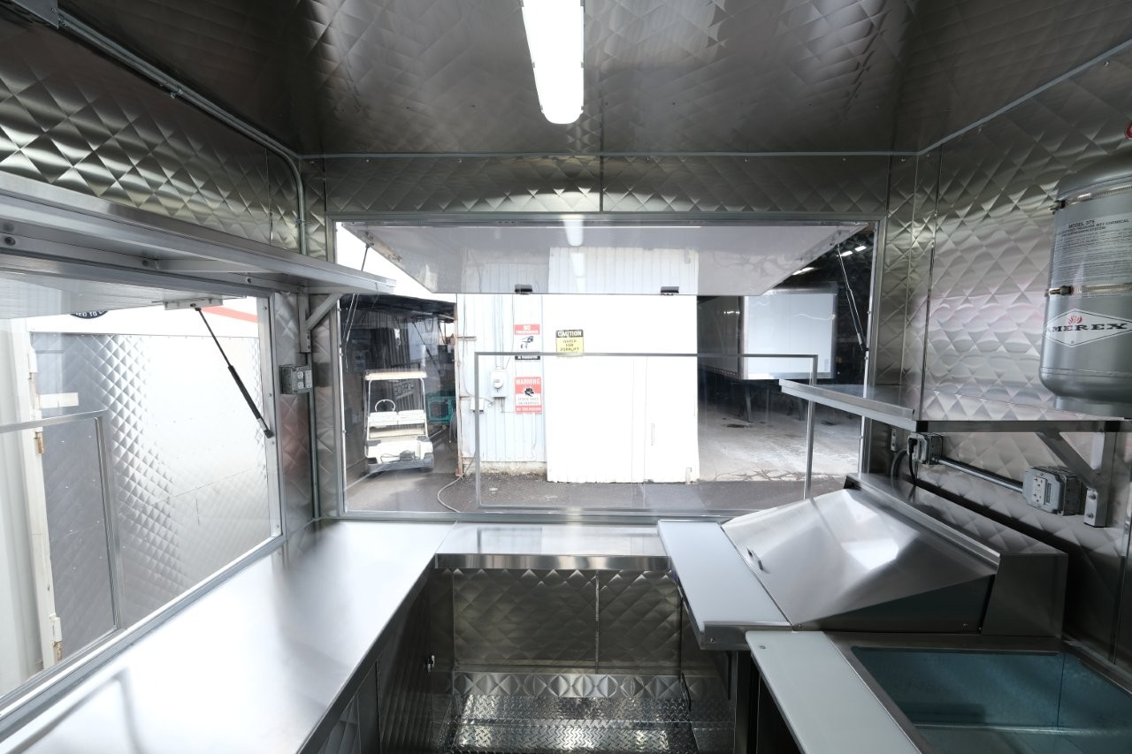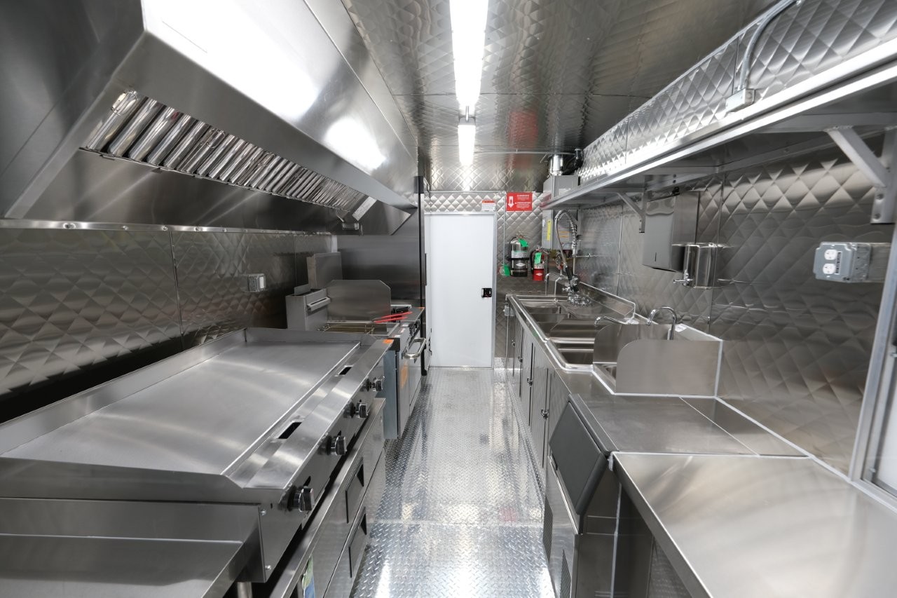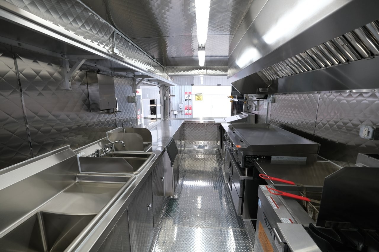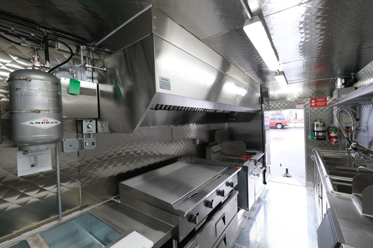 Custom wrap, 48″ griddle on a 52″ chef base, extra large rear window, deep fryer, 28″ mega-top sandwich prep table