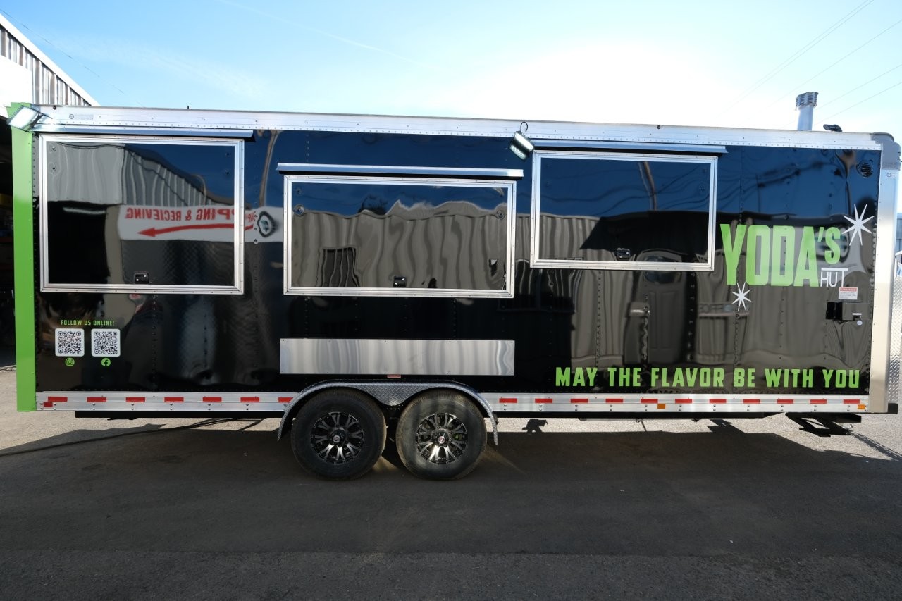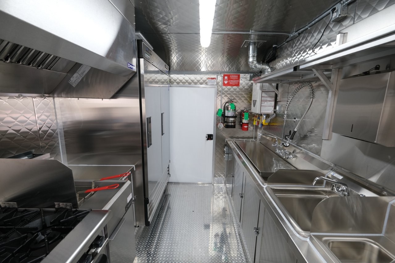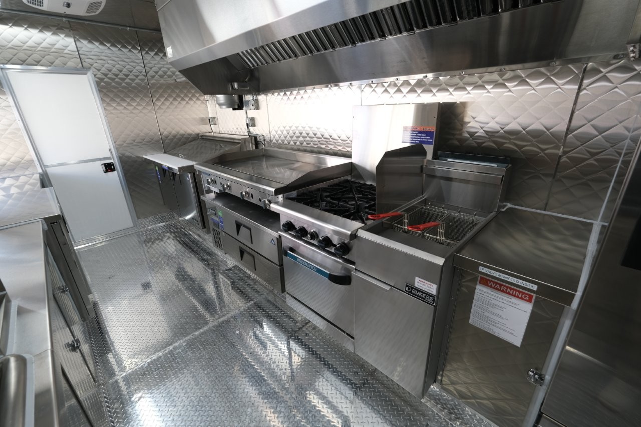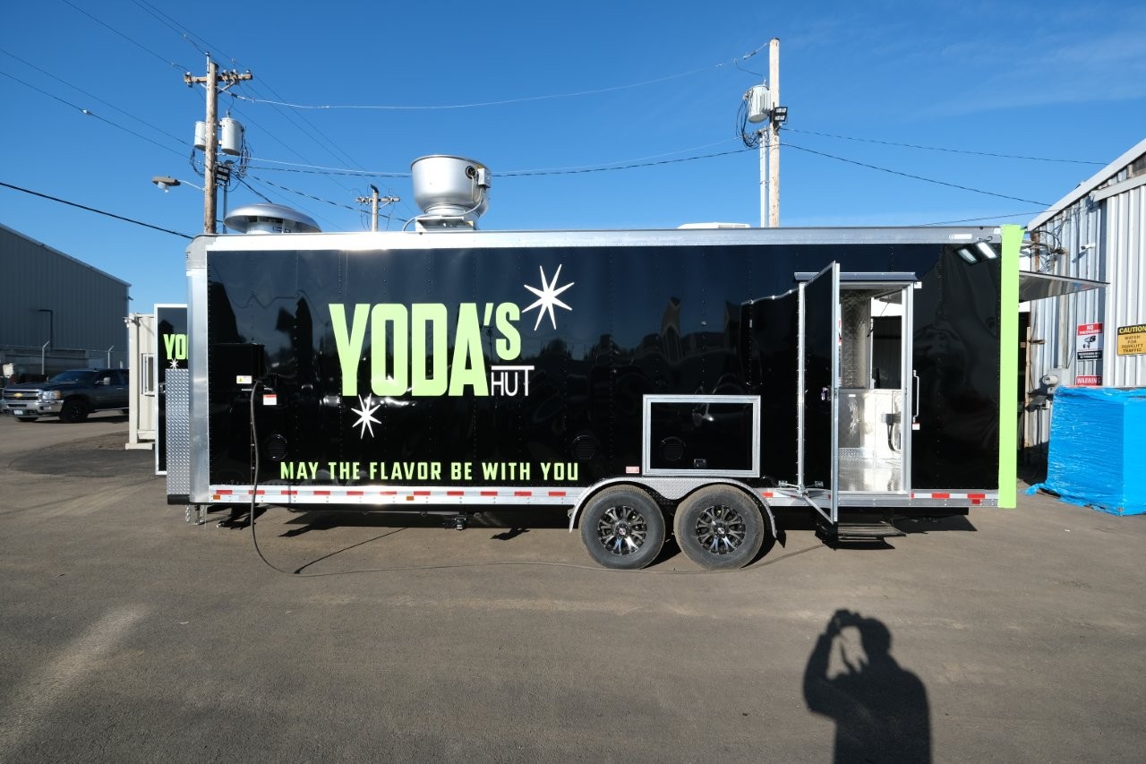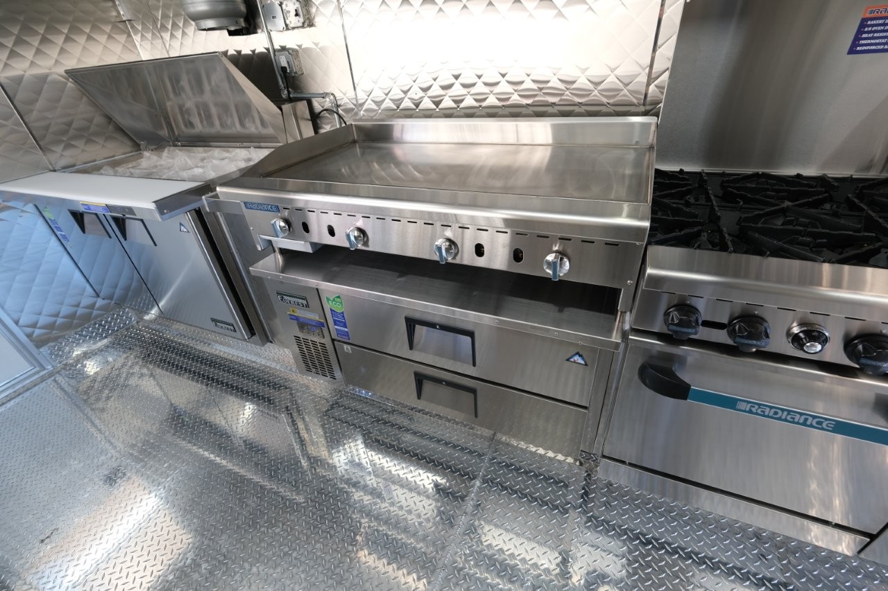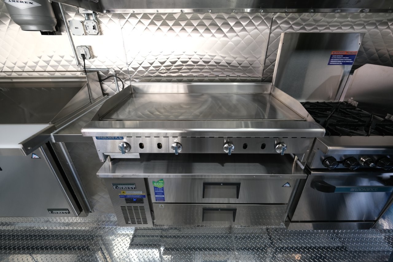 Custom wrap, digital TV menu, 6′ porch area, 48″ mega-top sandwich prep table, 48″ griddle on a 48″ chef base