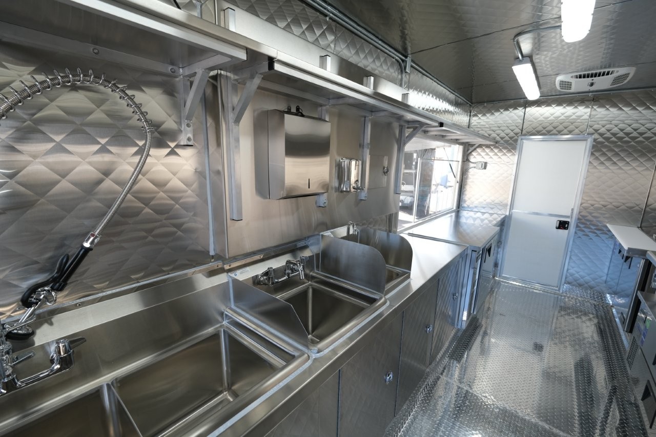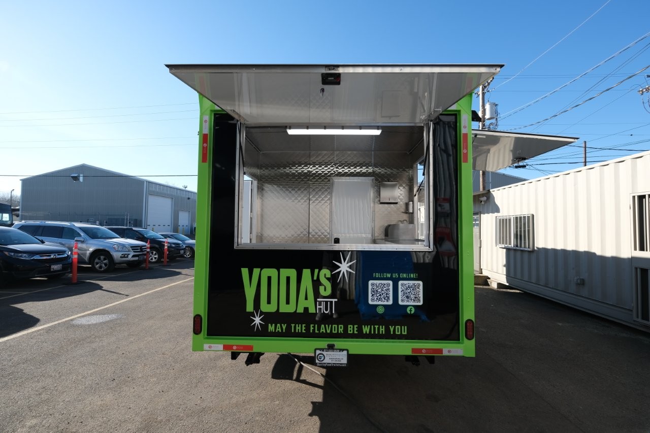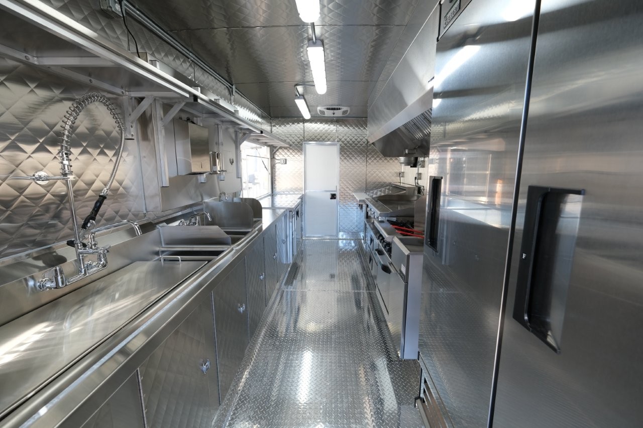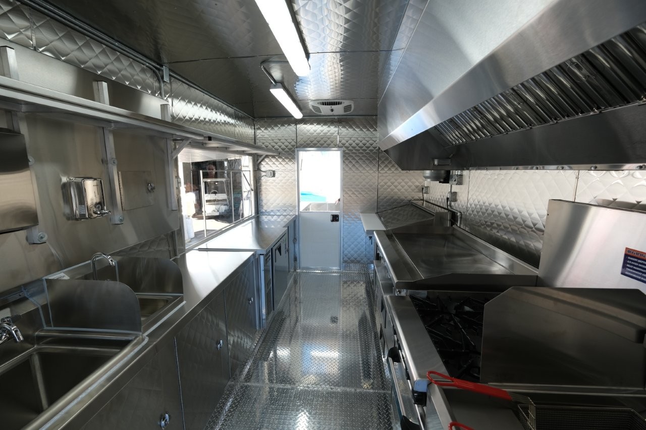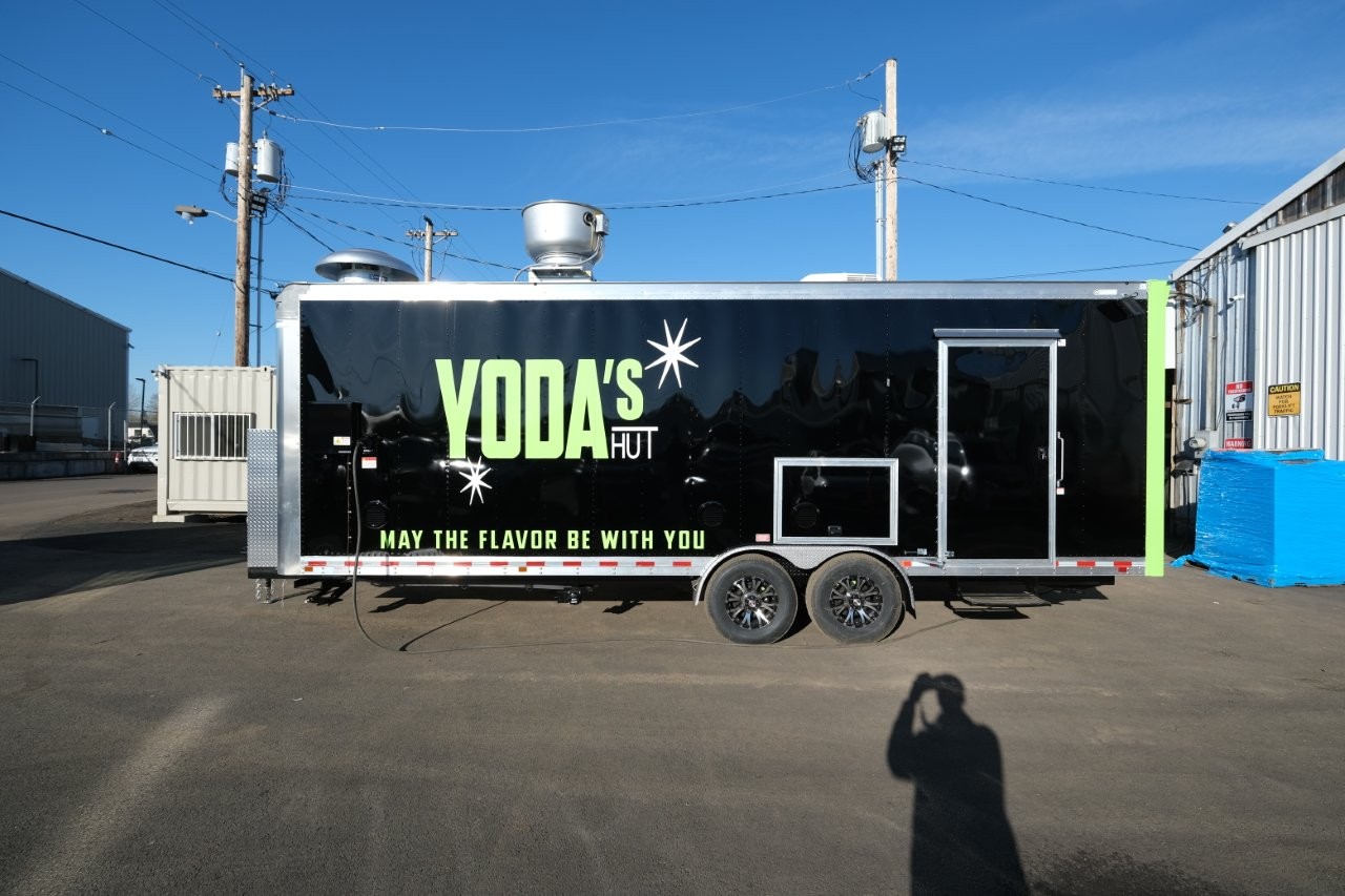 Custom wrap, digital TV menu, 6′ porch area, 48″ mega-top sandwich prep table, 48″ griddle on a 48″ chef base