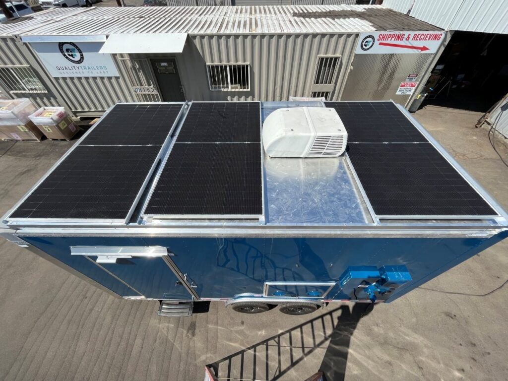 3 solar panels, 2 inverters, and 2 batteries running the trailer, shave ice machine, ice holding bin, exterior LED lighting
