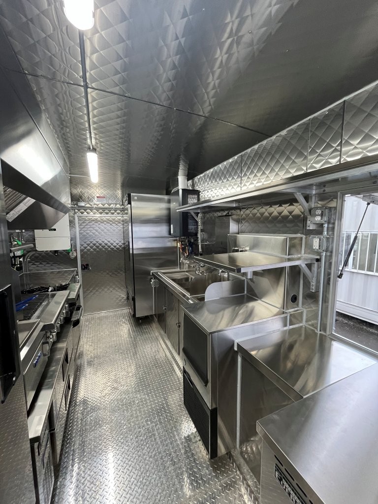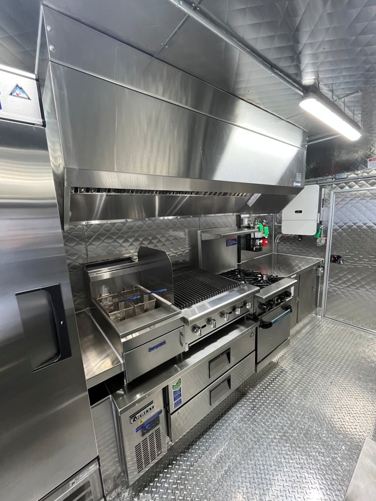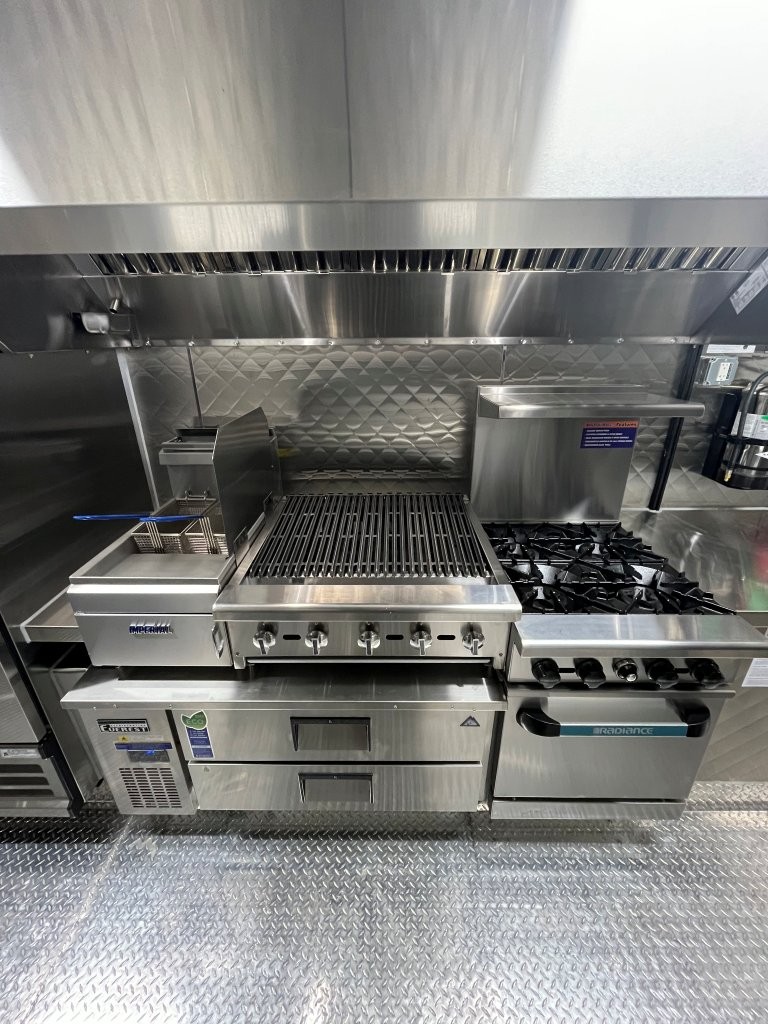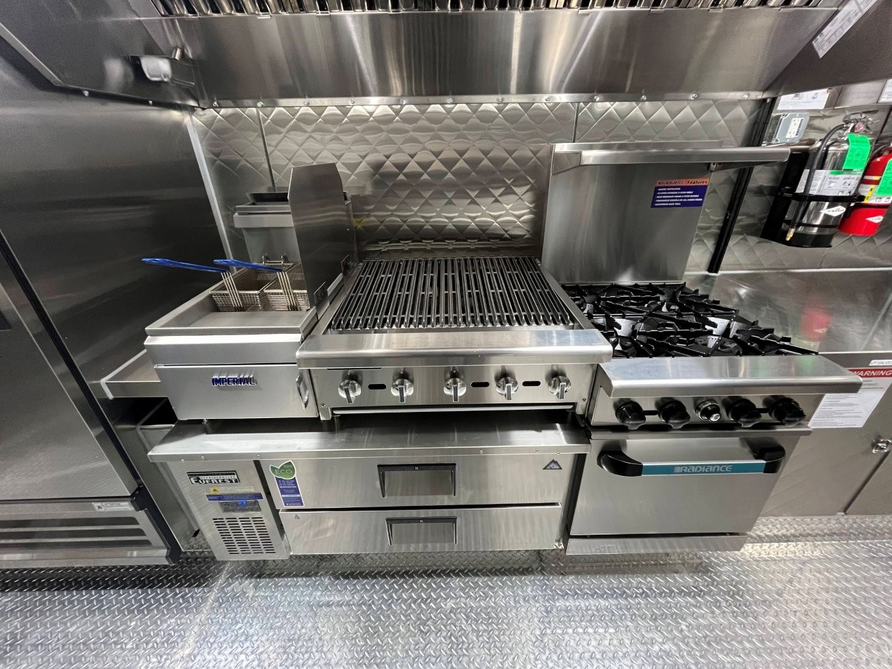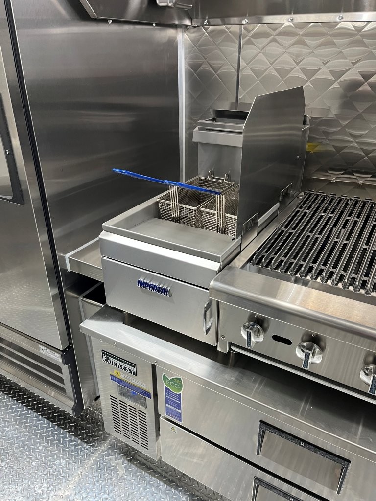 Battery operated, kiosk window, ice machine, 24″ charbroiler, 25-pound double basket fryer, 48″ refrigerated chef base