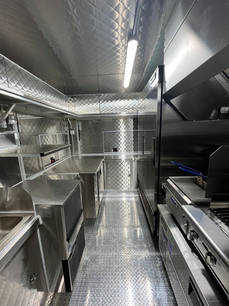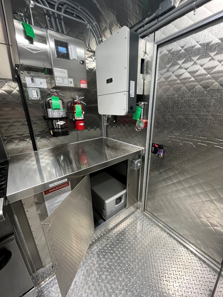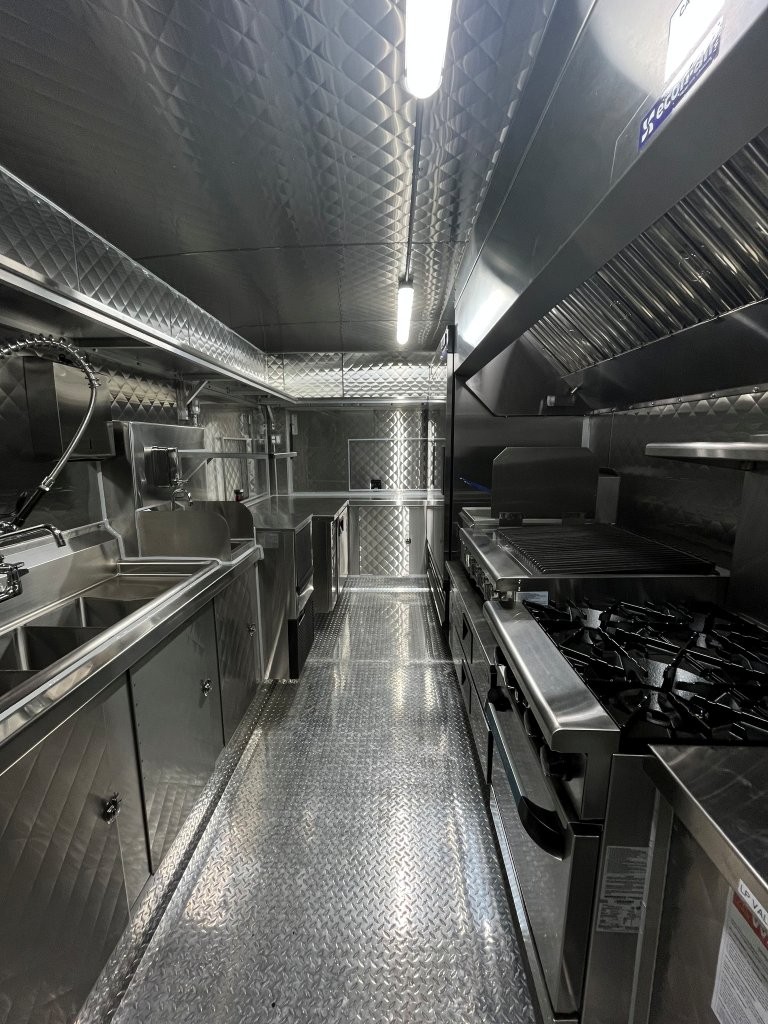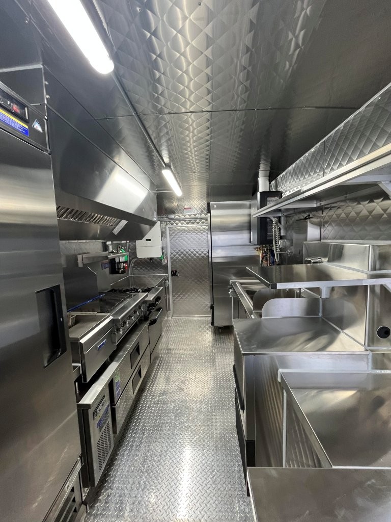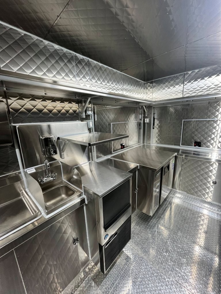 Battery operated, kiosk window, ice machine, 24″ charbroiler, 25-pound double basket fryer, 48″ refrigerated chef base
