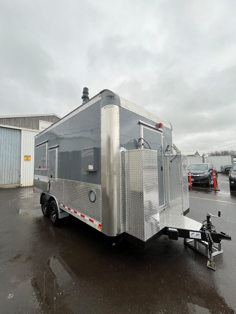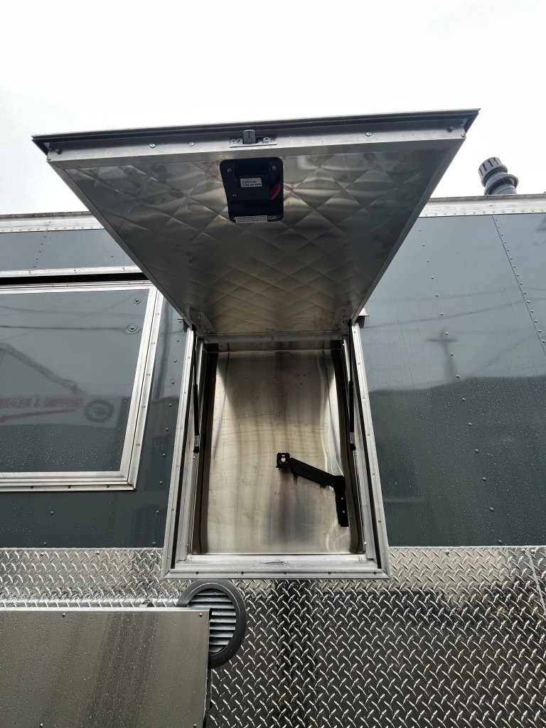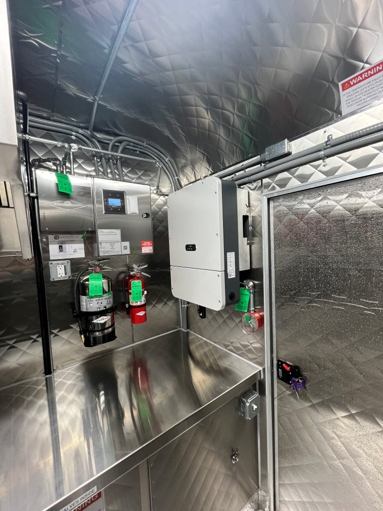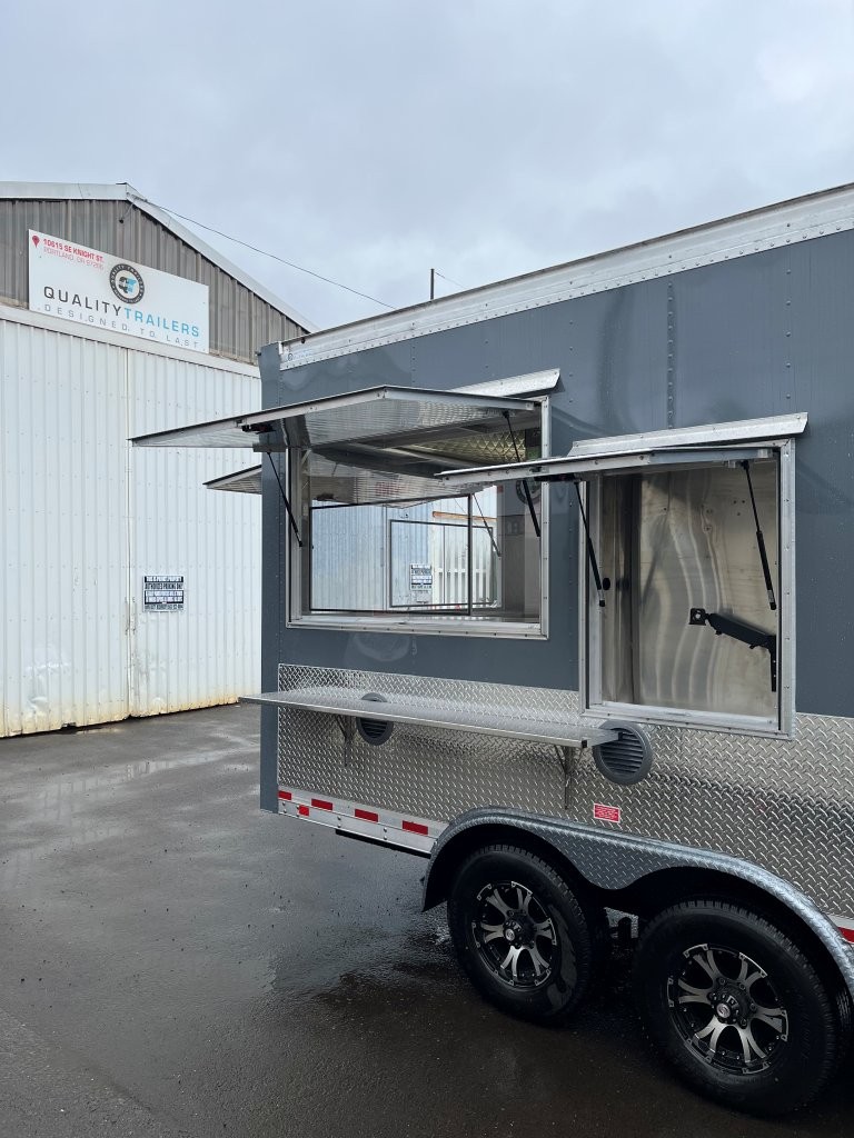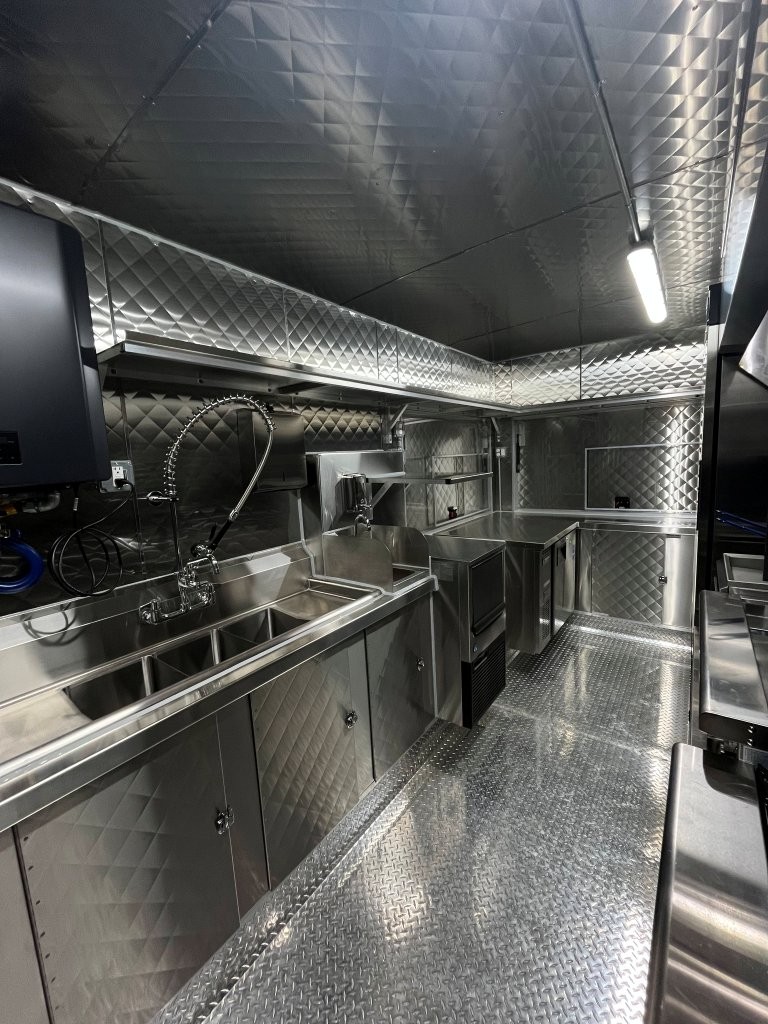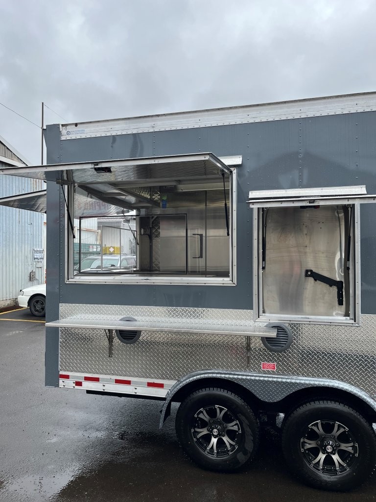 Battery operated, kiosk window, ice machine, 24″ charbroiler, 25-pound double basket fryer, 48″ refrigerated chef base