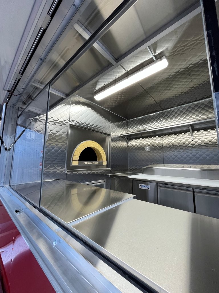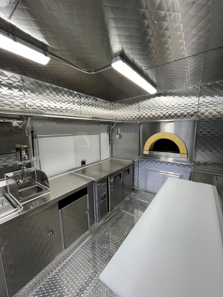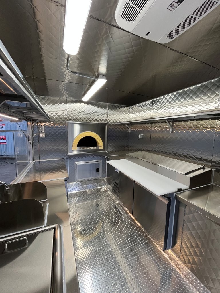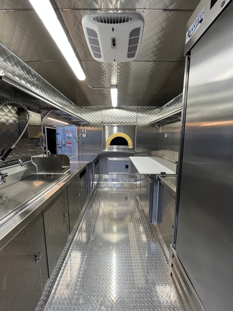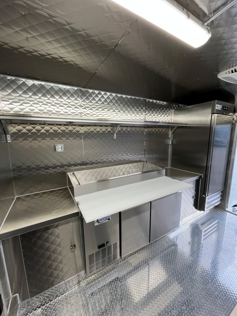 1-door refrigerator, 60″ pizza prep table, 48″ undercounter refrigerator, side-mounted generator platform, cash drawer space