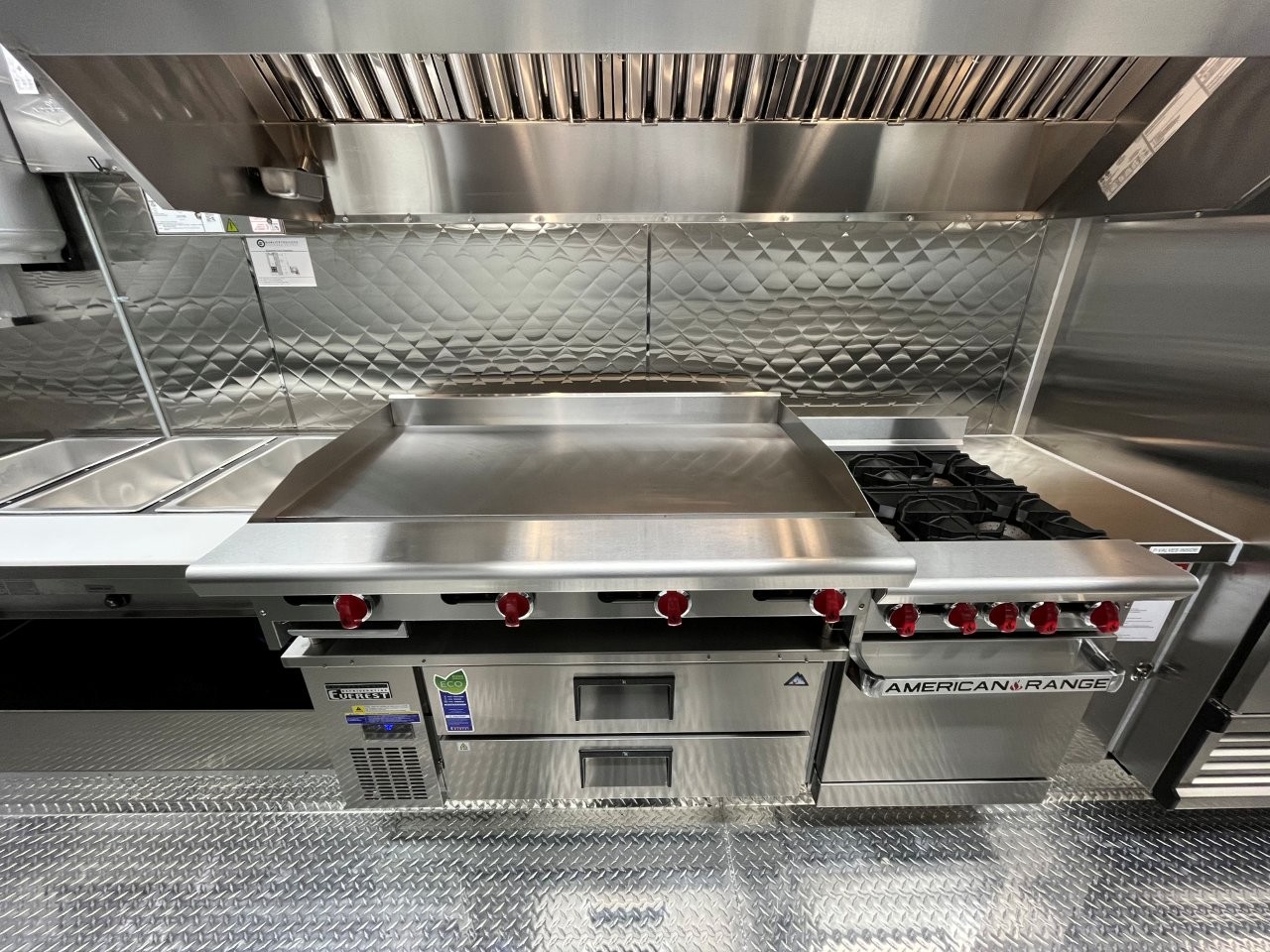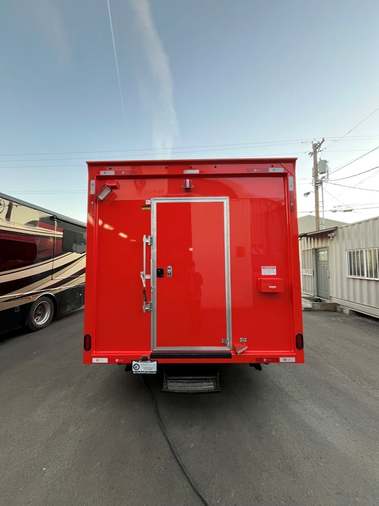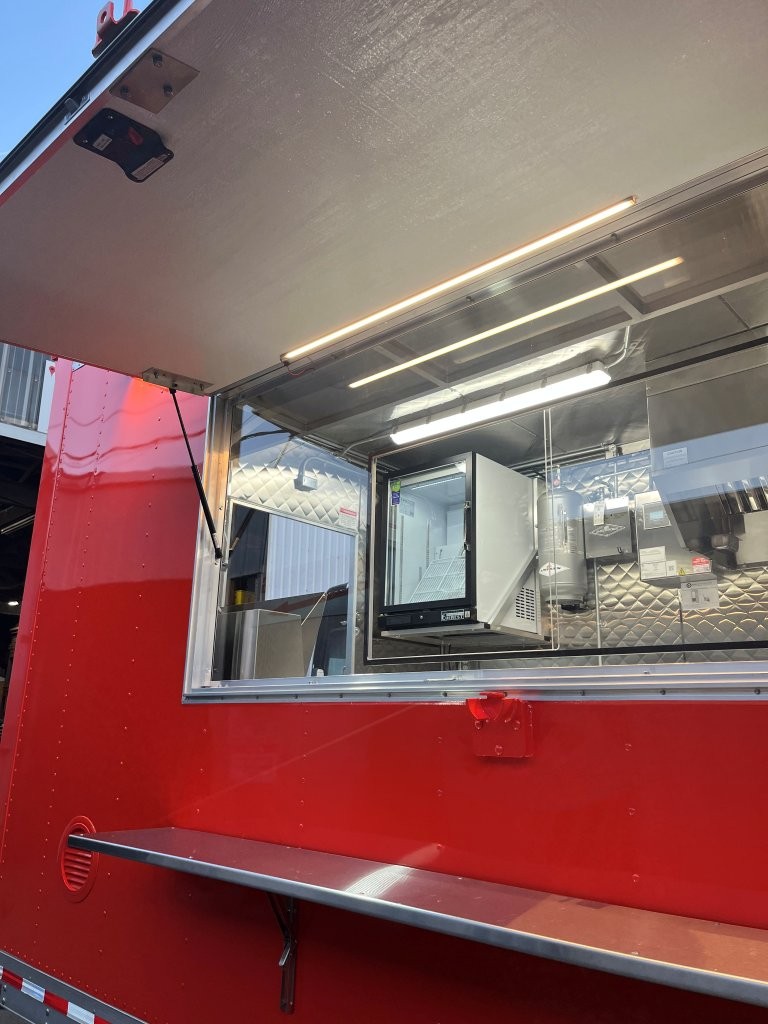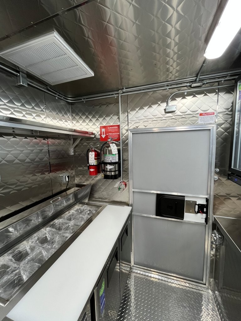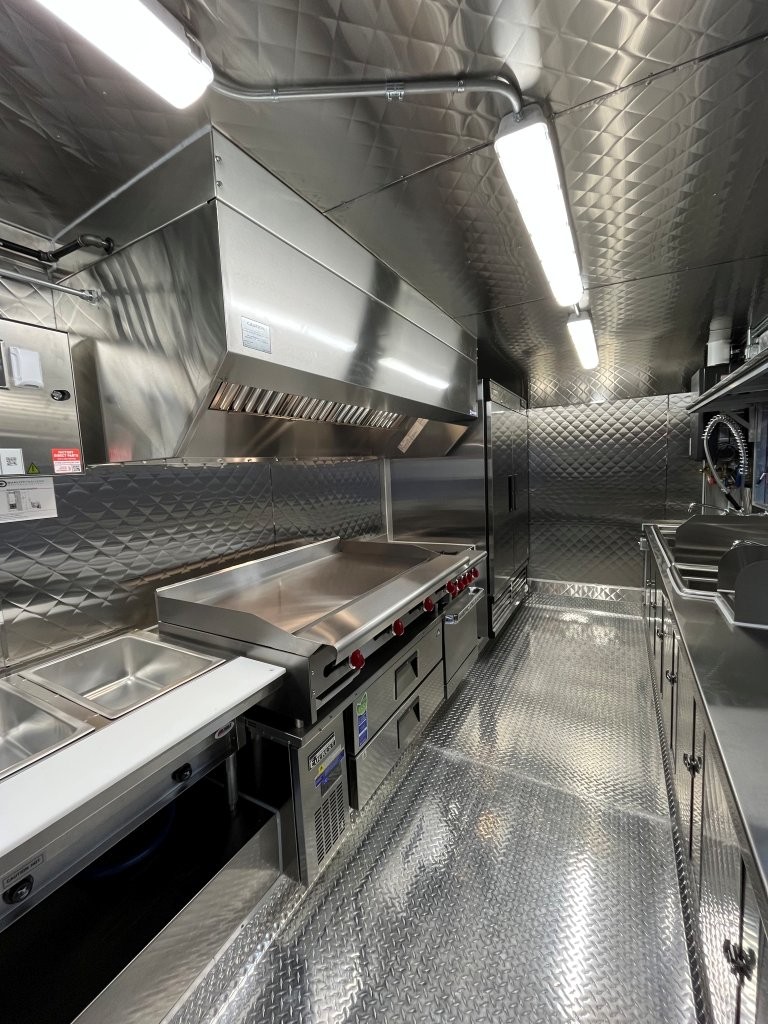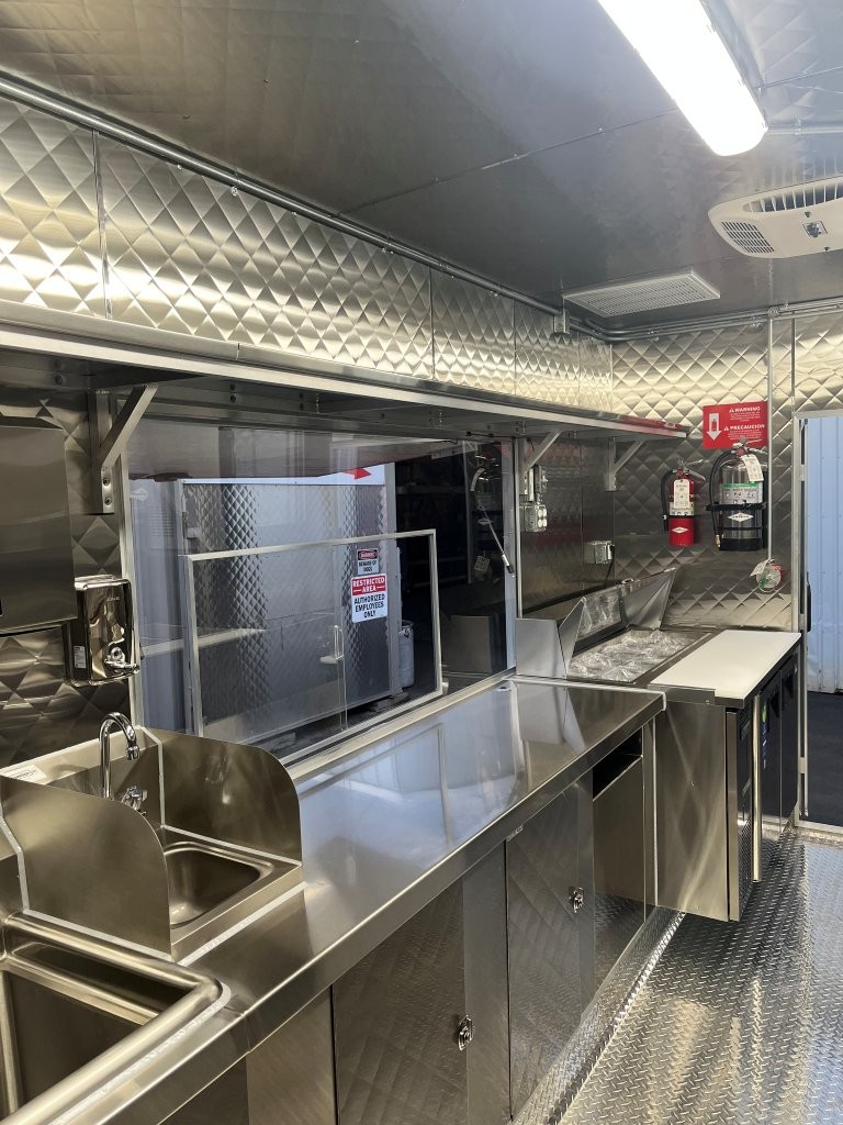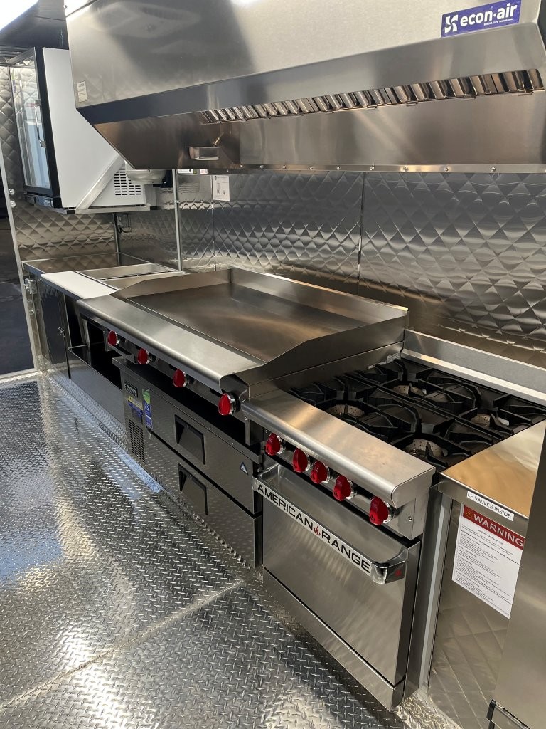 Generator platform, small solid plexiglass viewing window, security locks on doors and windows, 48″ griddle with a chef base below