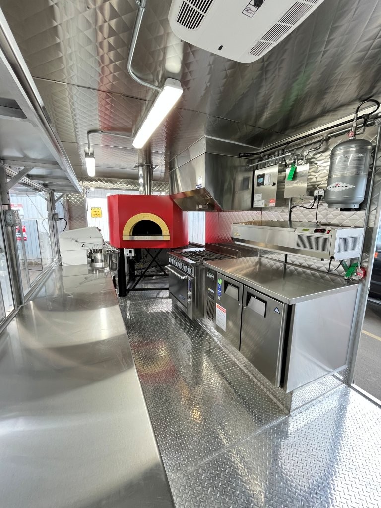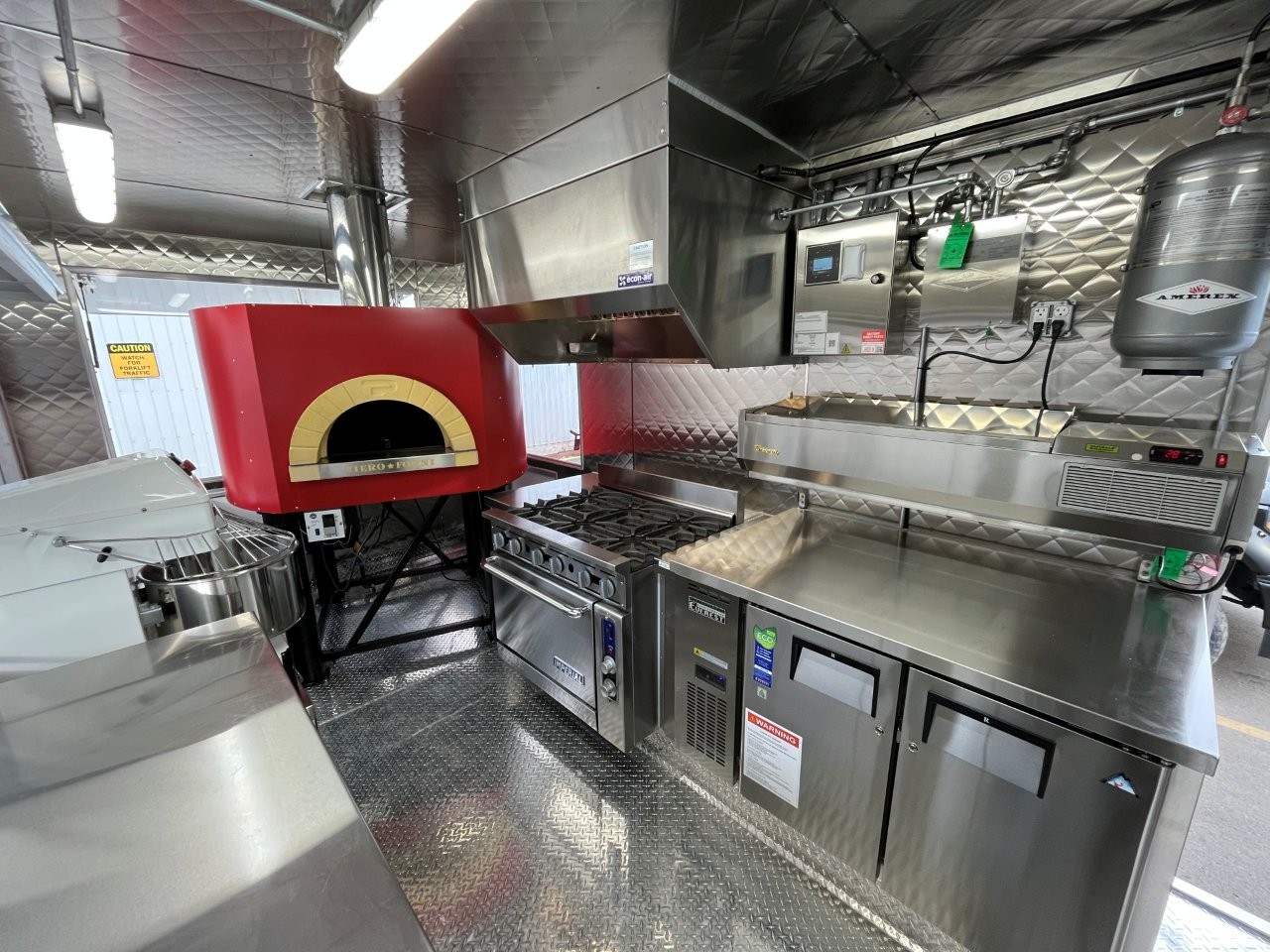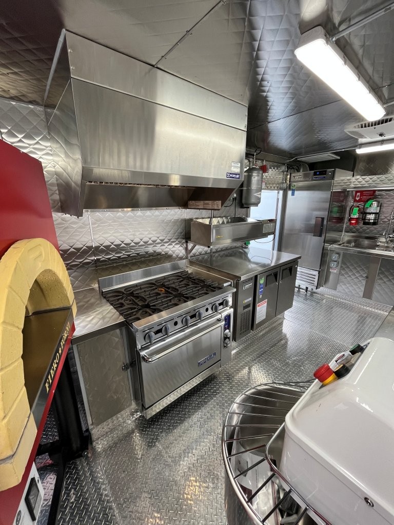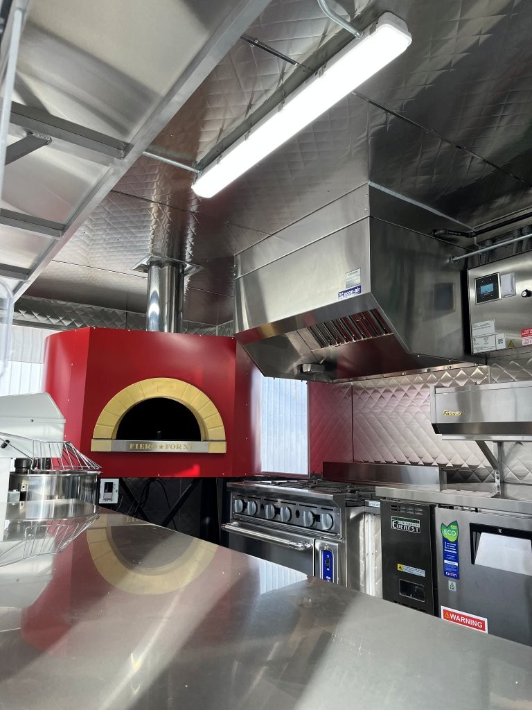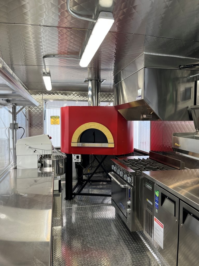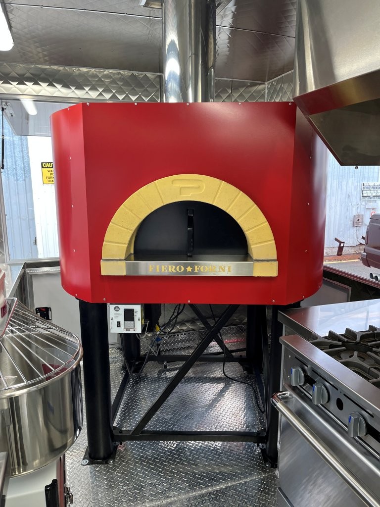 Wood and propane-fired Fiero Forni oven model 120, mixer, 6-open burner/convection oven, insulated grey fresh and grey water tanks