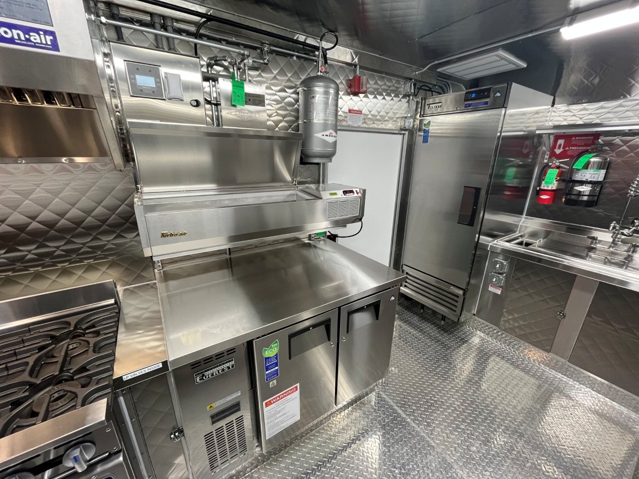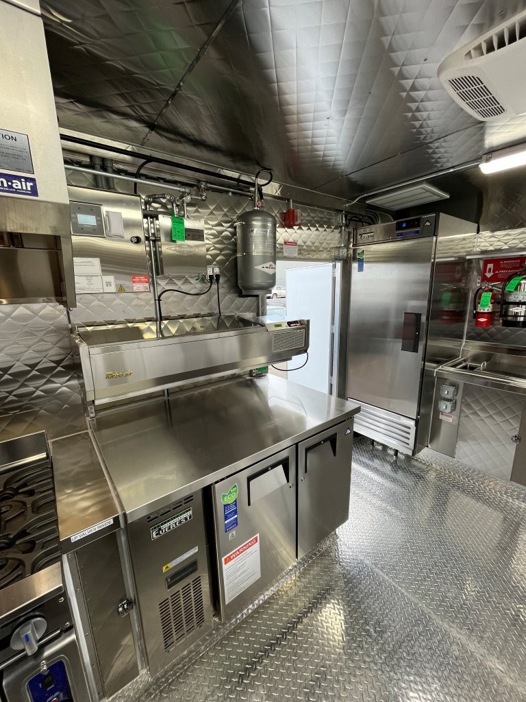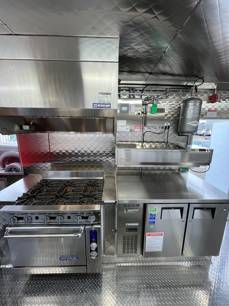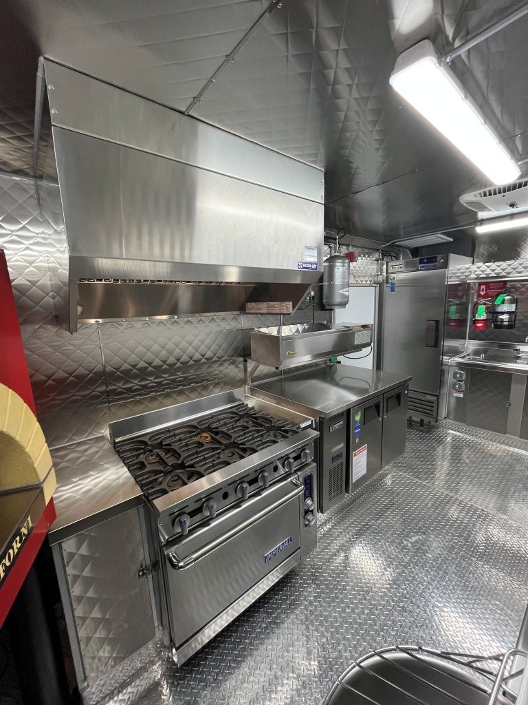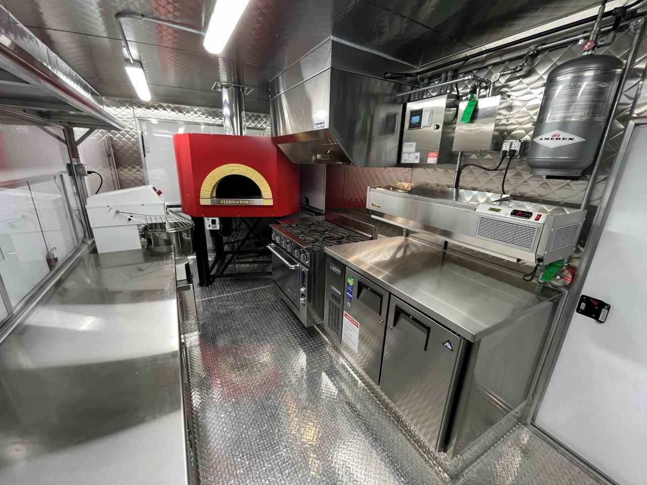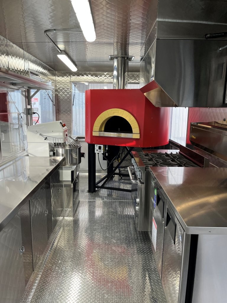 Wood and propane-fired Fiero Forni oven model 120, mixer, 6-open burner/convection oven, insulated grey fresh and grey water tanks