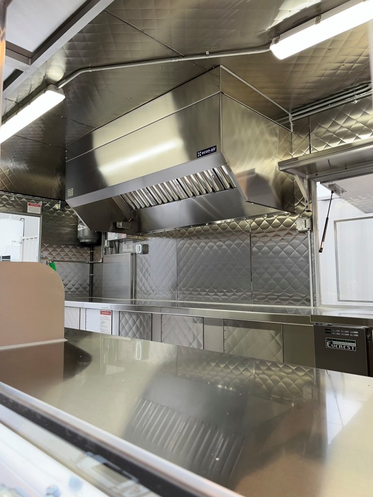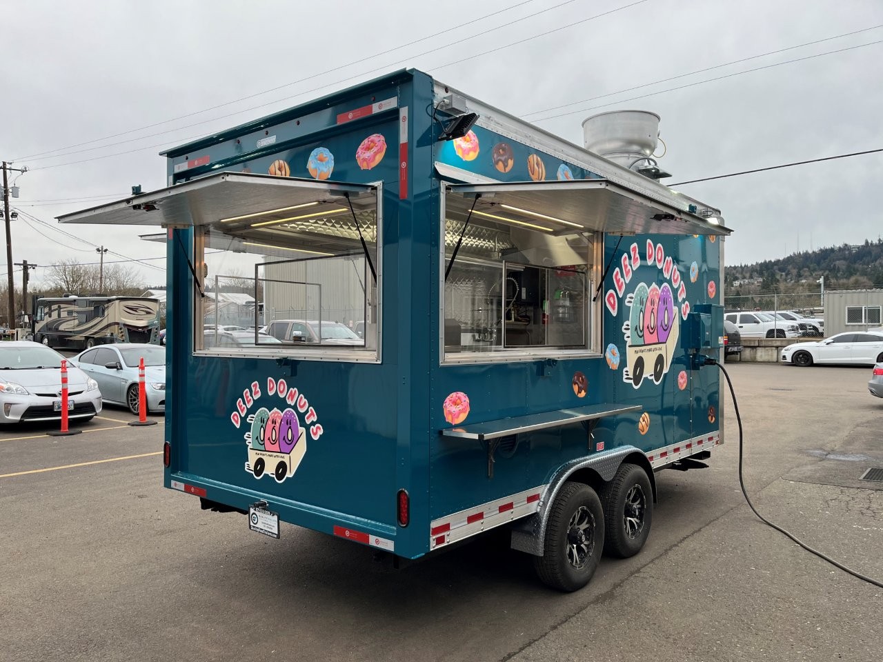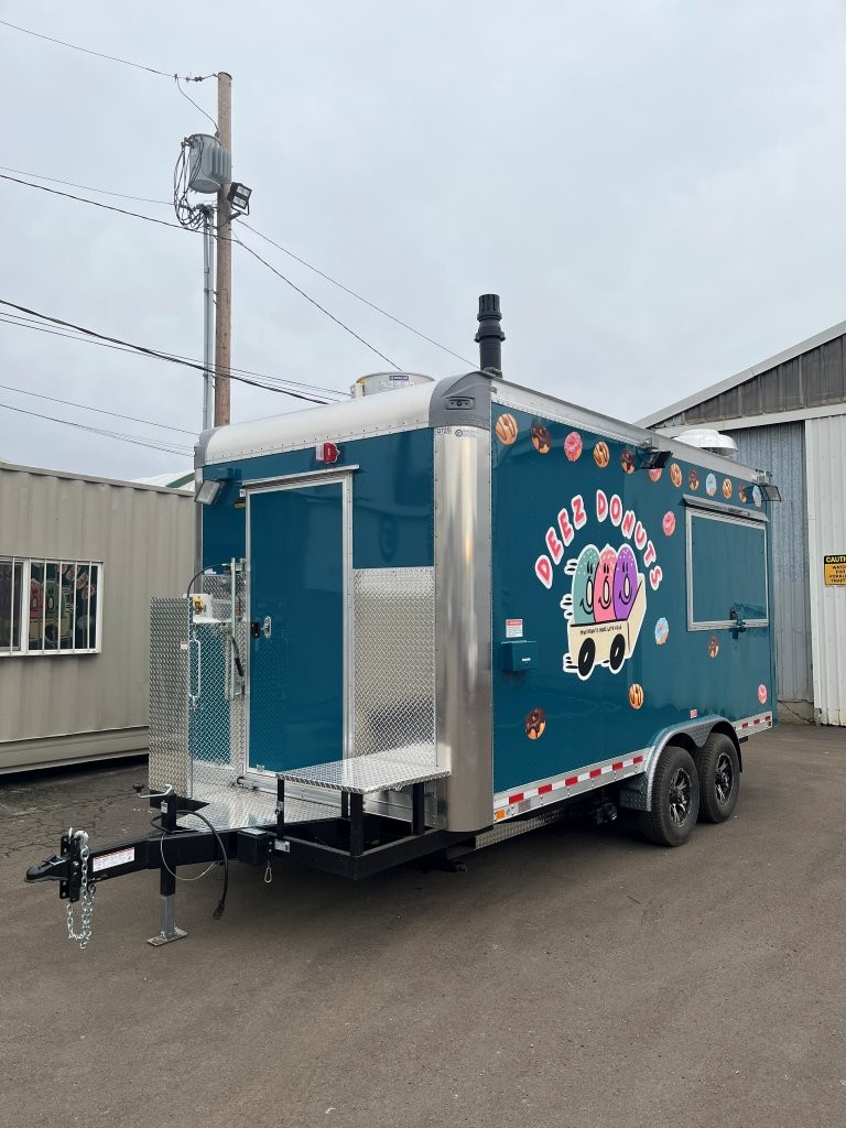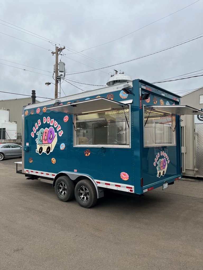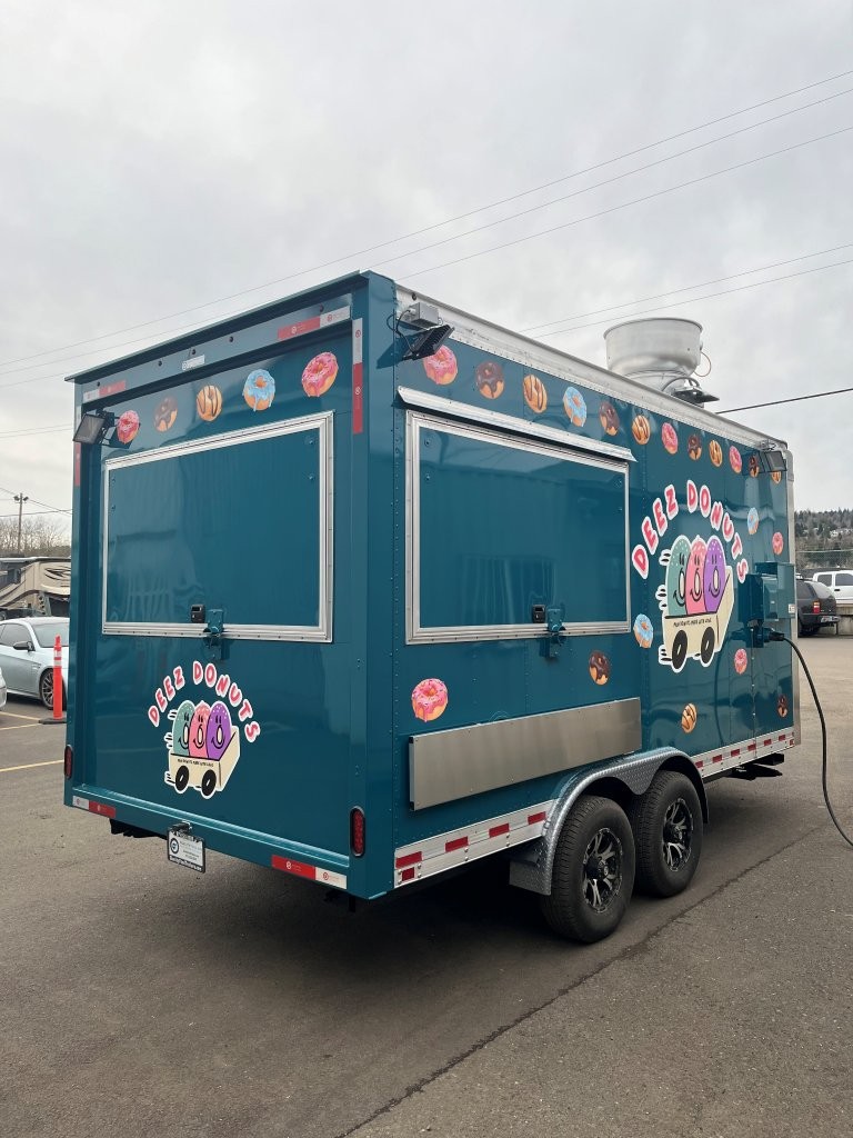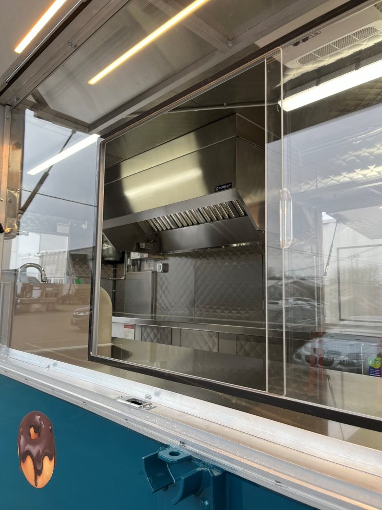 Three windows, security locks on doors and windows, insulated grey fresh and grey water tanks, side-mounted generator platform, hood set-up for mini donut frying machine