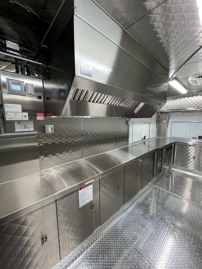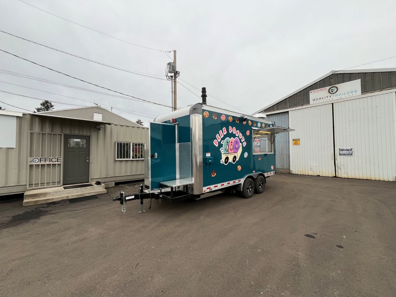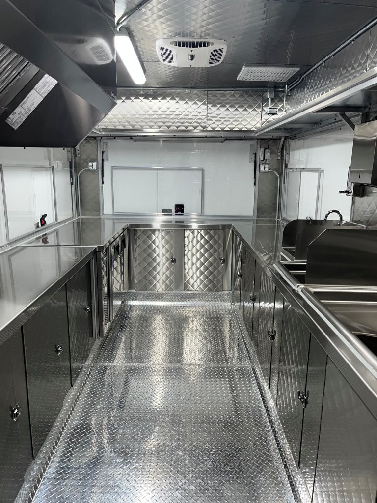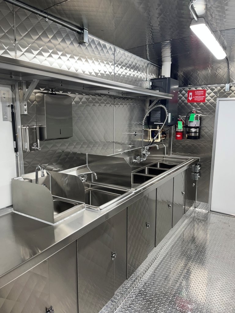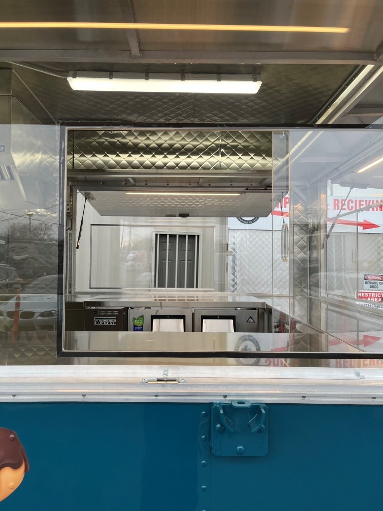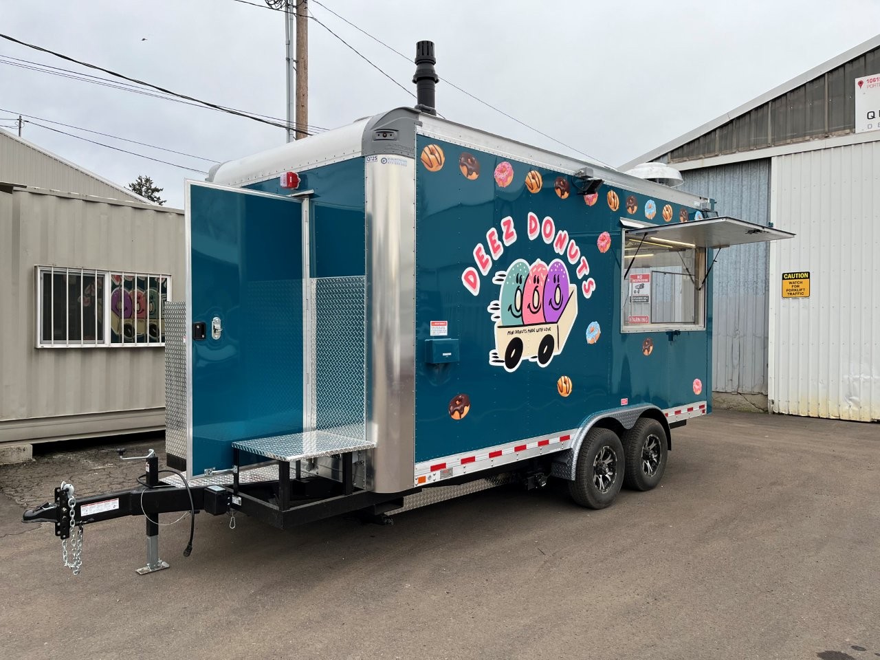 Three windows, security locks on doors and windows, insulated grey fresh and grey water tanks, side-mounted generator platform, hood set-up for mini donut frying machine