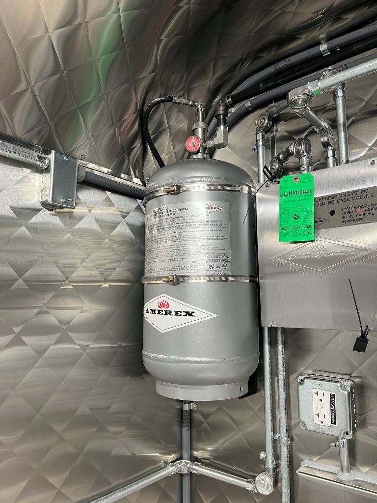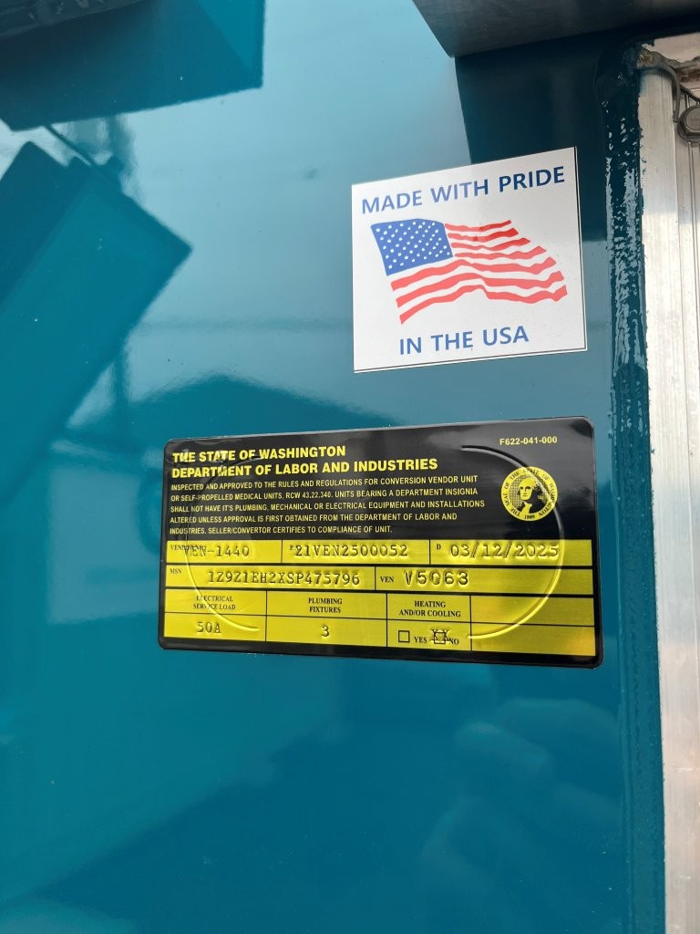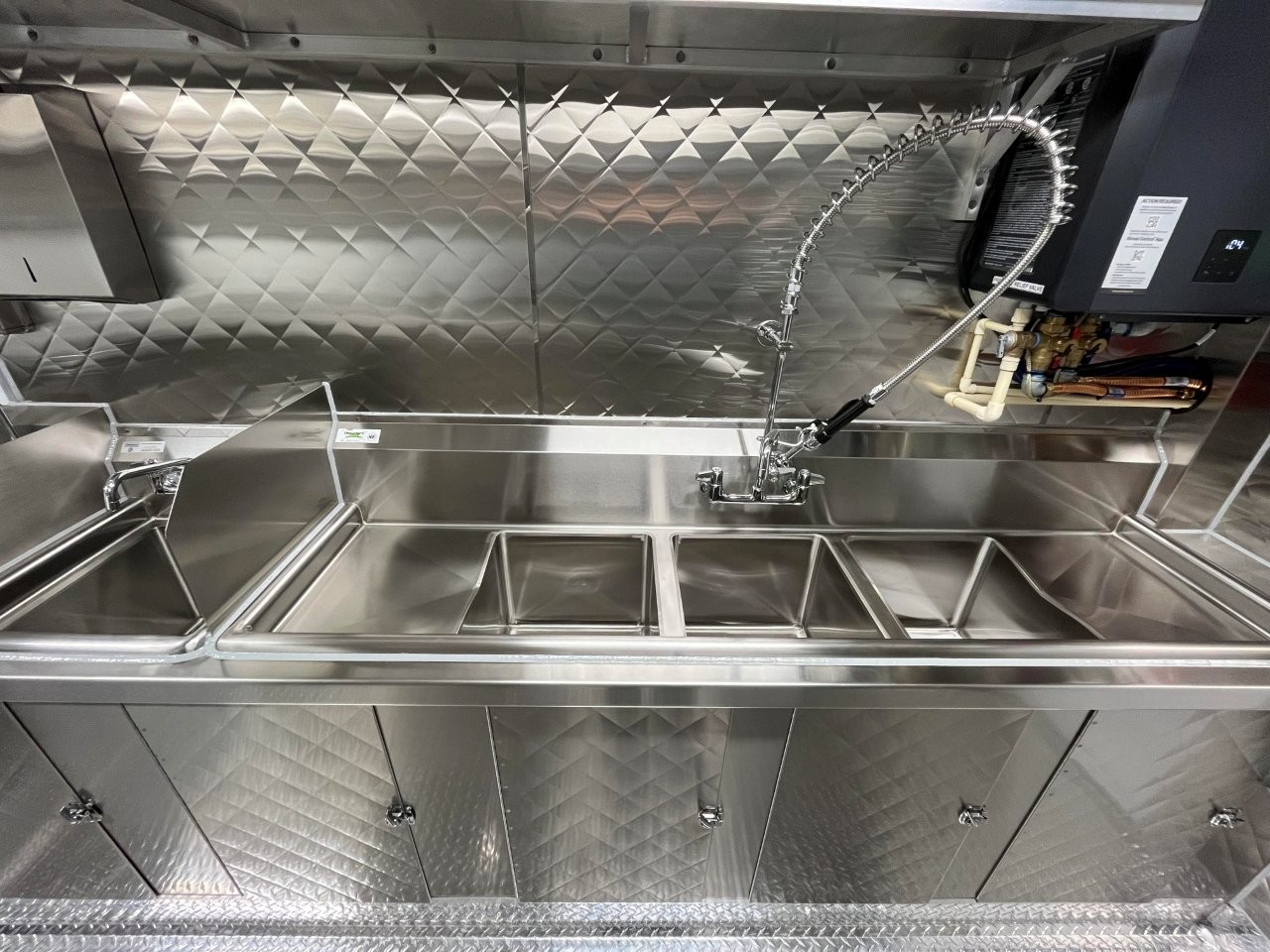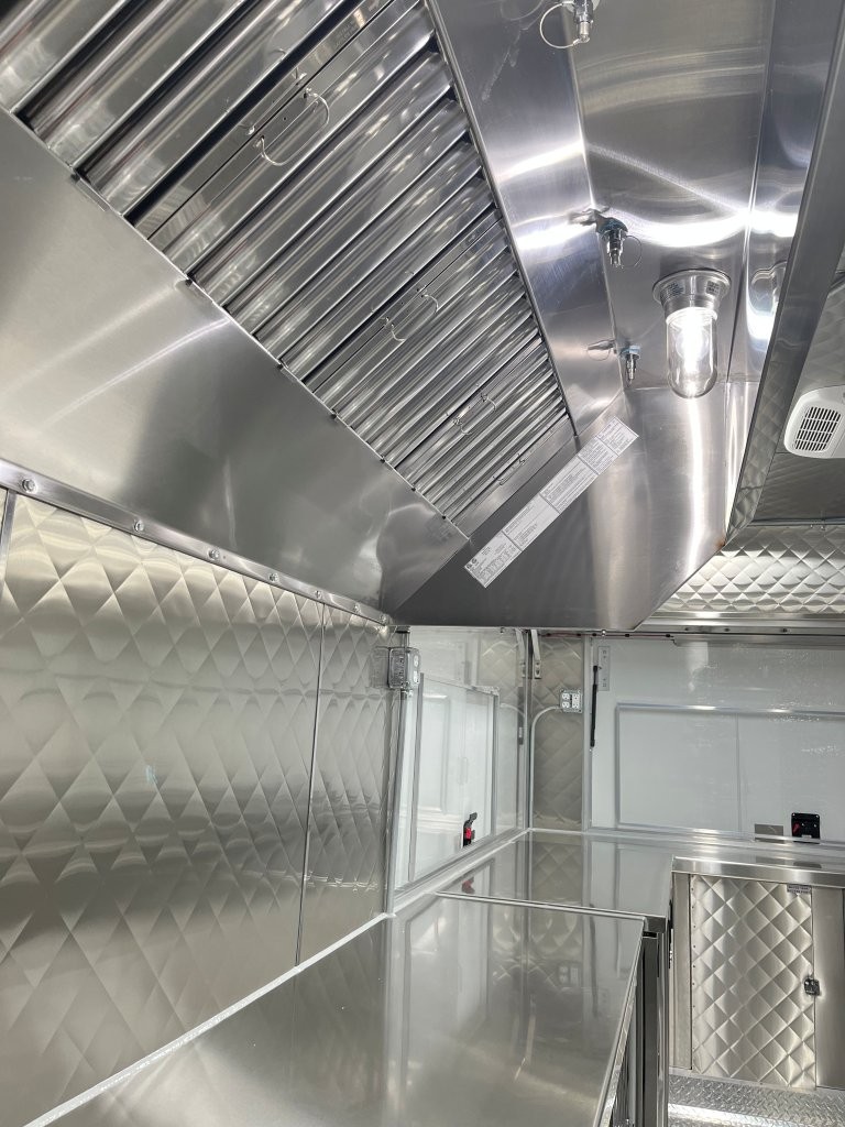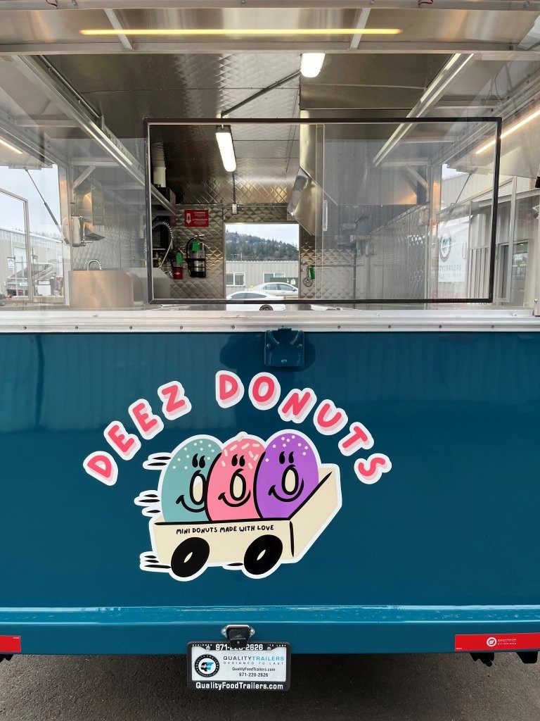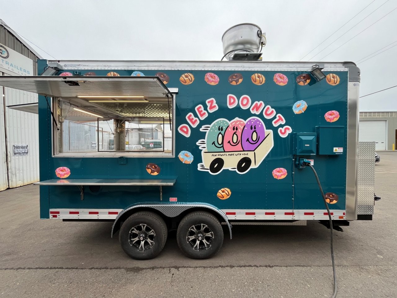 Three windows, security locks on doors and windows, insulated grey fresh and grey water tanks, side-mounted generator platform, hood set-up for mini donut frying machine