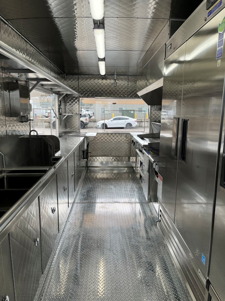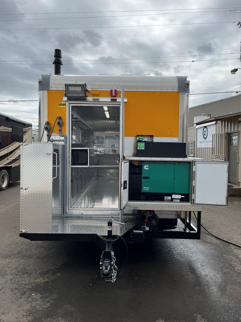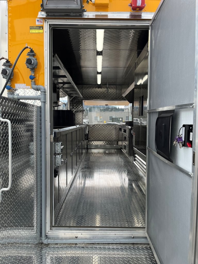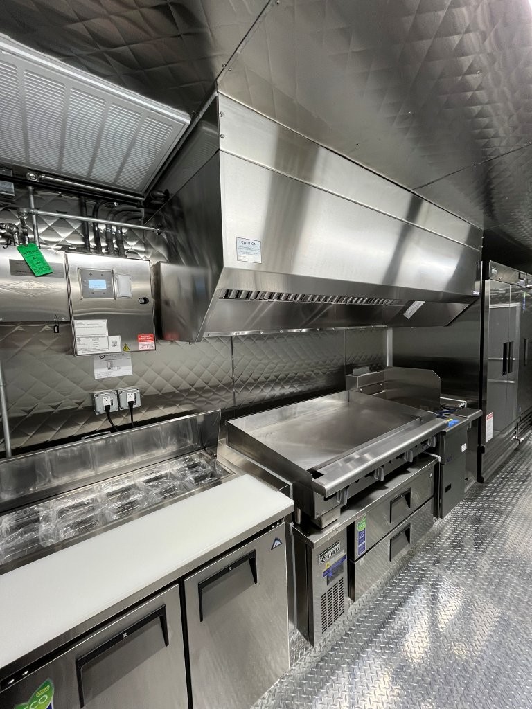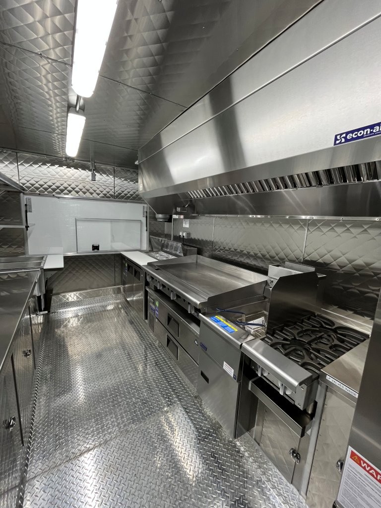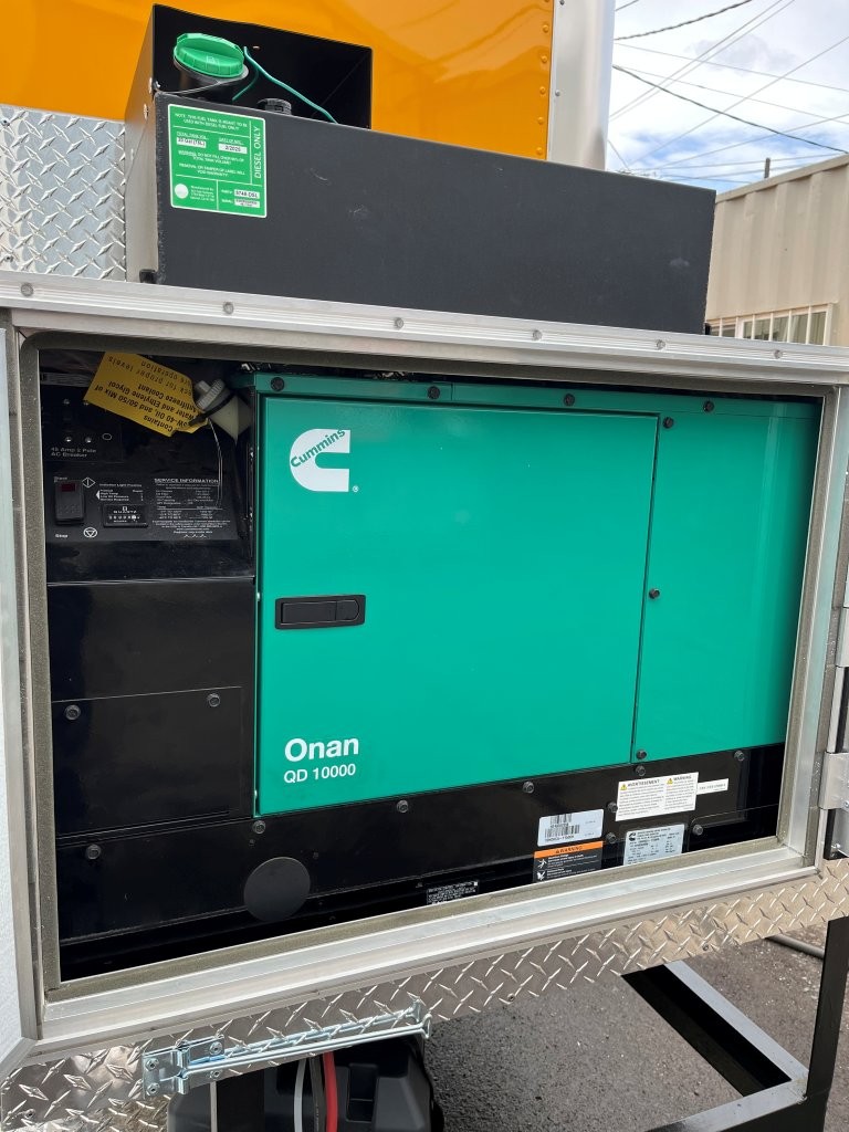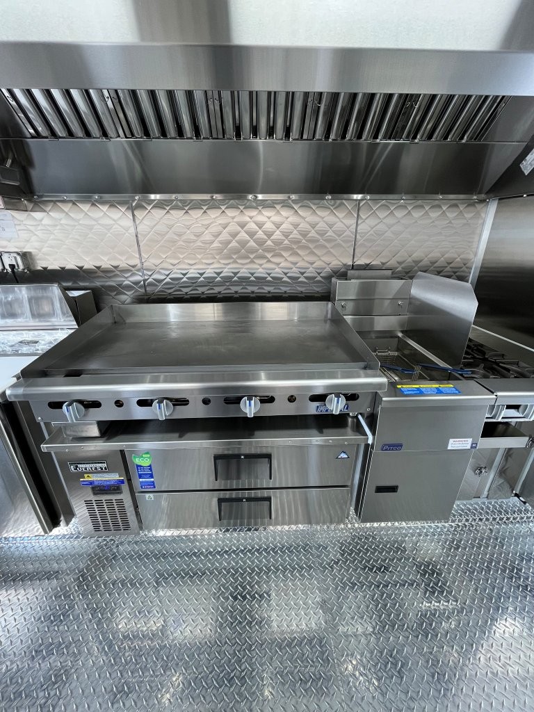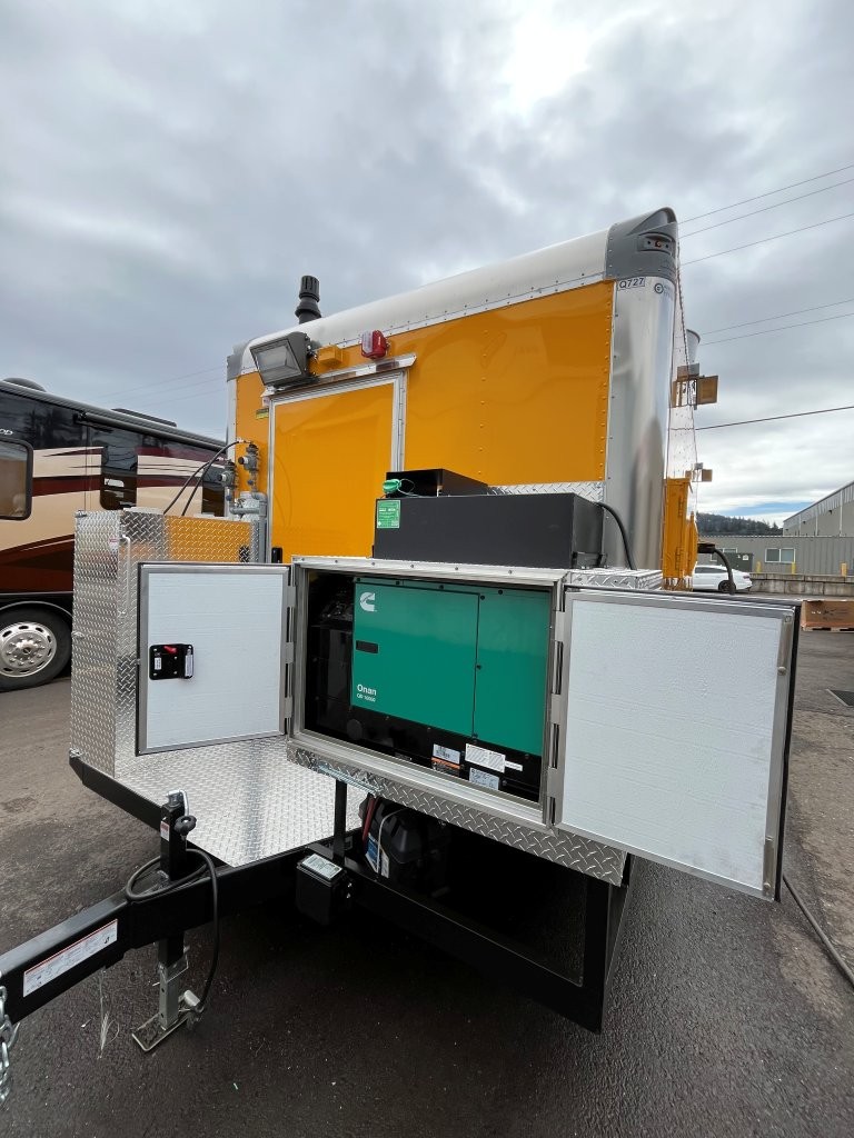 48″ griddle with a refrigerated chef base below, 10kW diesel Cummins generator, electric tongue jack, special request exterior LED lights