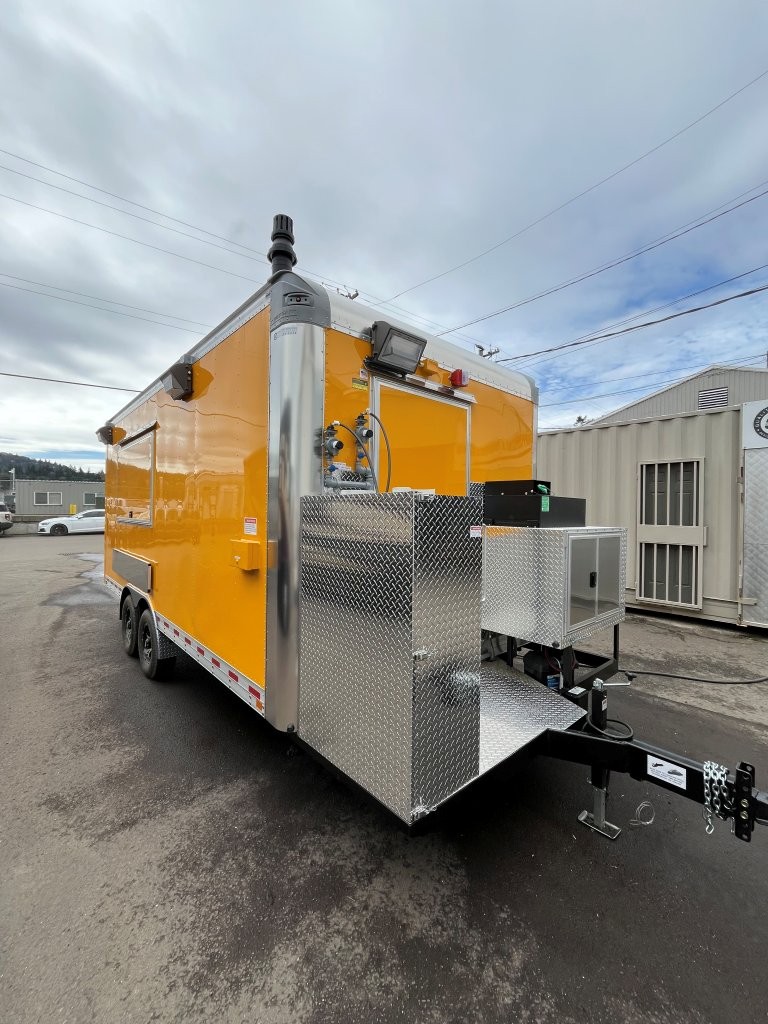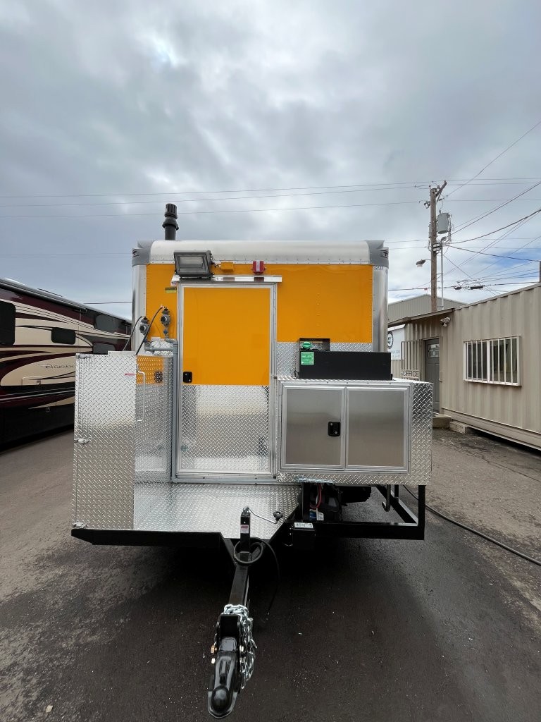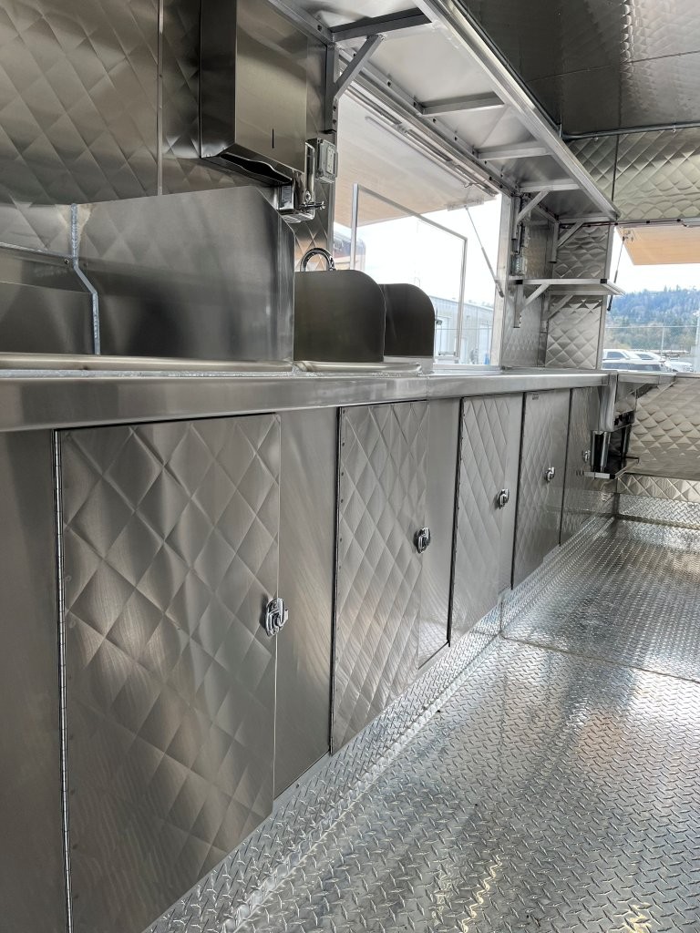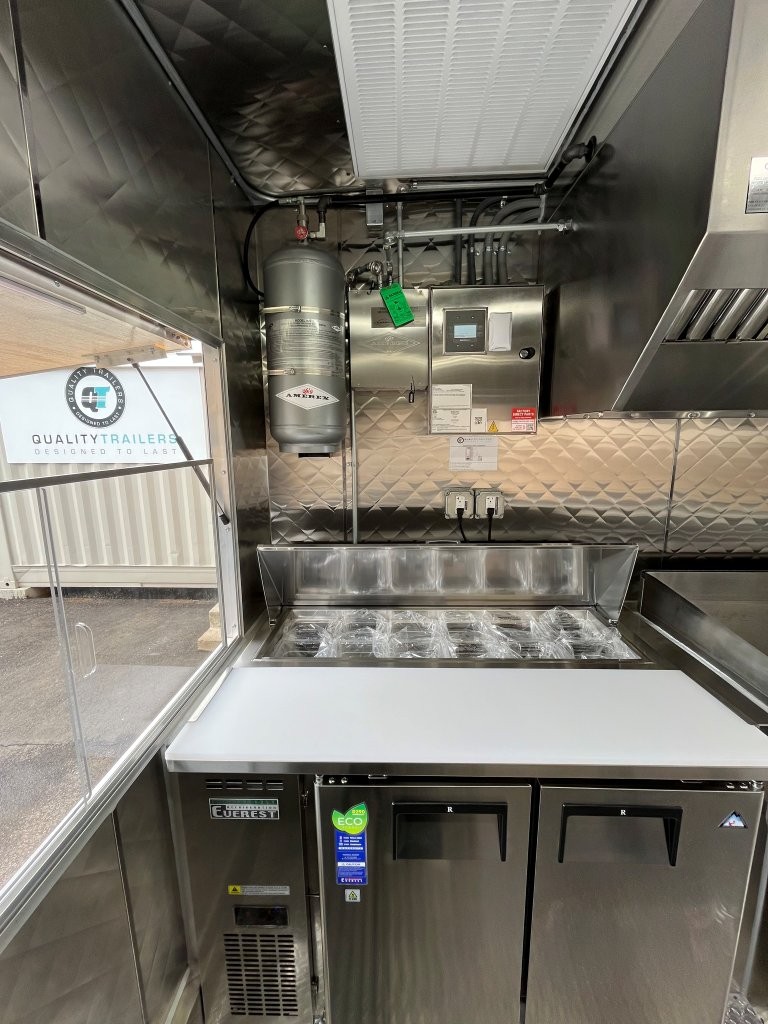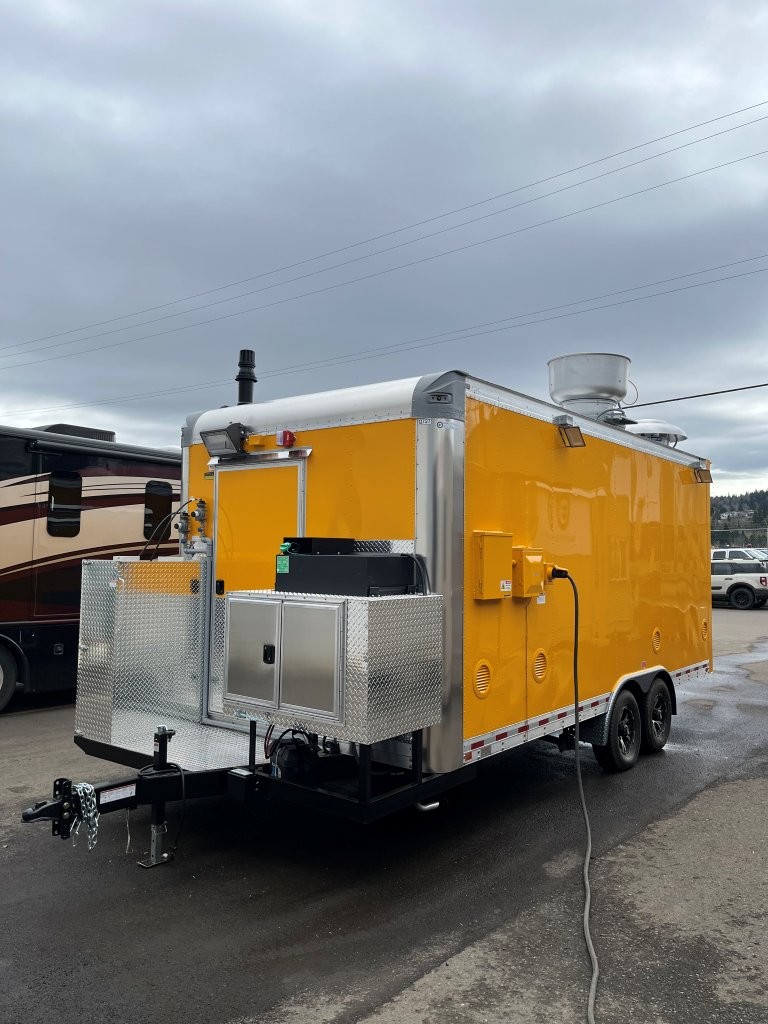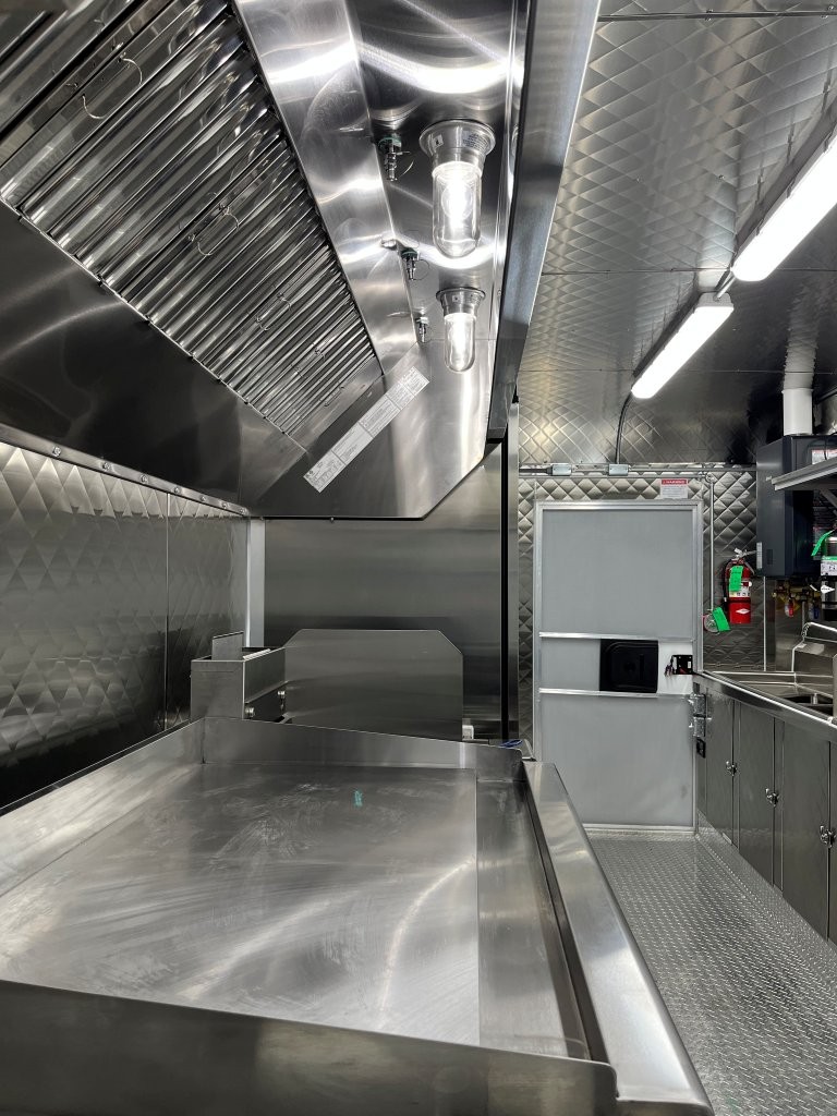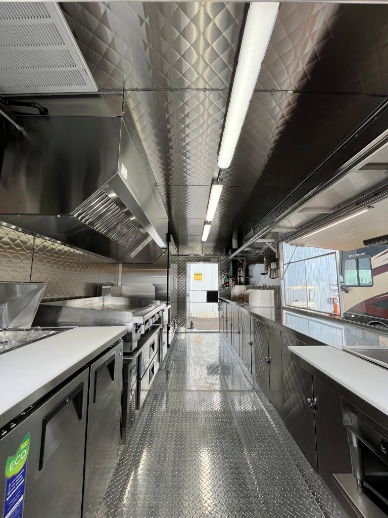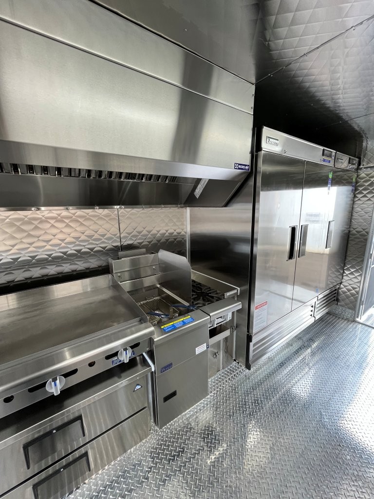 48″ griddle with a refrigerated chef base below, 10kW diesel Cummins generator, electric tongue jack, special request exterior LED lights